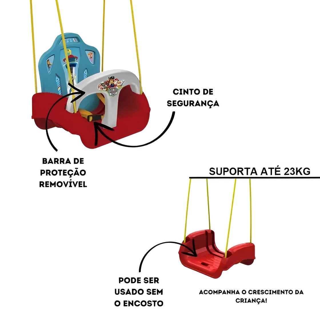 Prepare-se para muita diversão com o Balanço Infantil 3 em 1 Patrulha Canina! Ideal para crianças de 19 a 36 meses, este balanço colorido e resistente proporciona momentos de alegria enquanto estimula o equilíbrio e a coordenação motora dos pequenos. Com estrutura versátil 3 em 1, ele acompanha o crescimento da criança, podendo ser usado com ou sem encosto e barra de proteção.