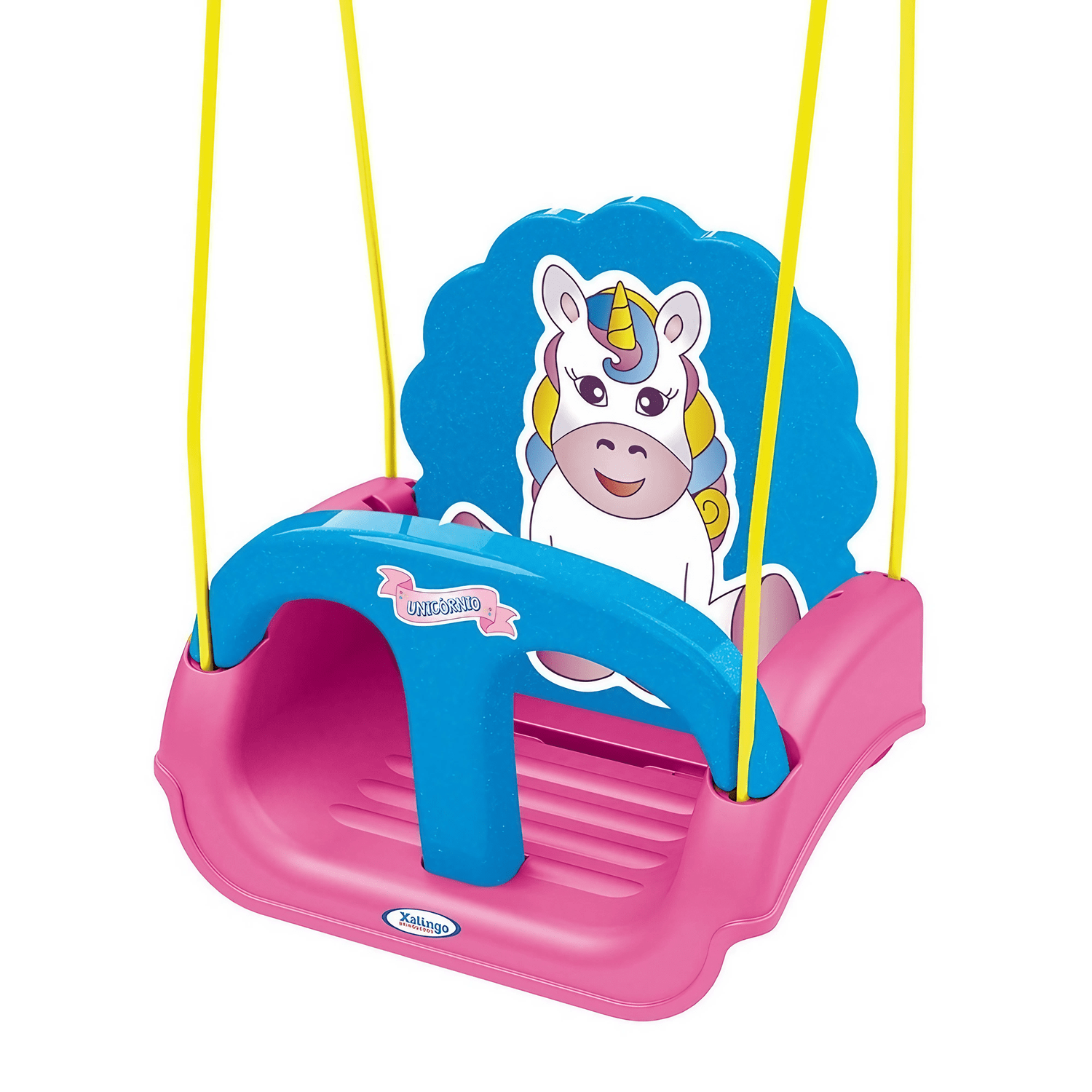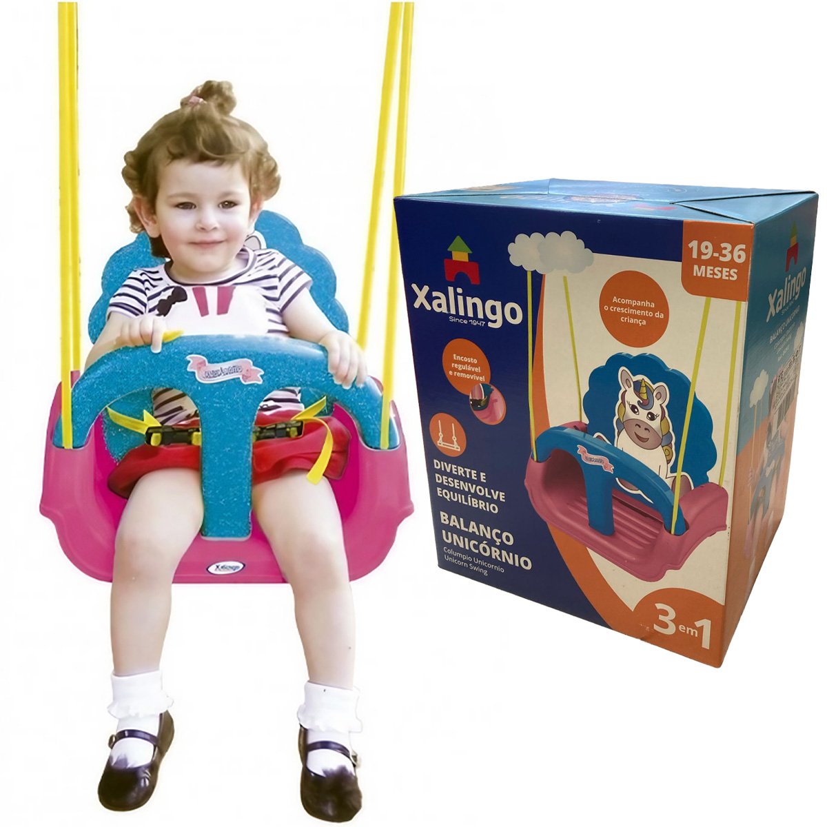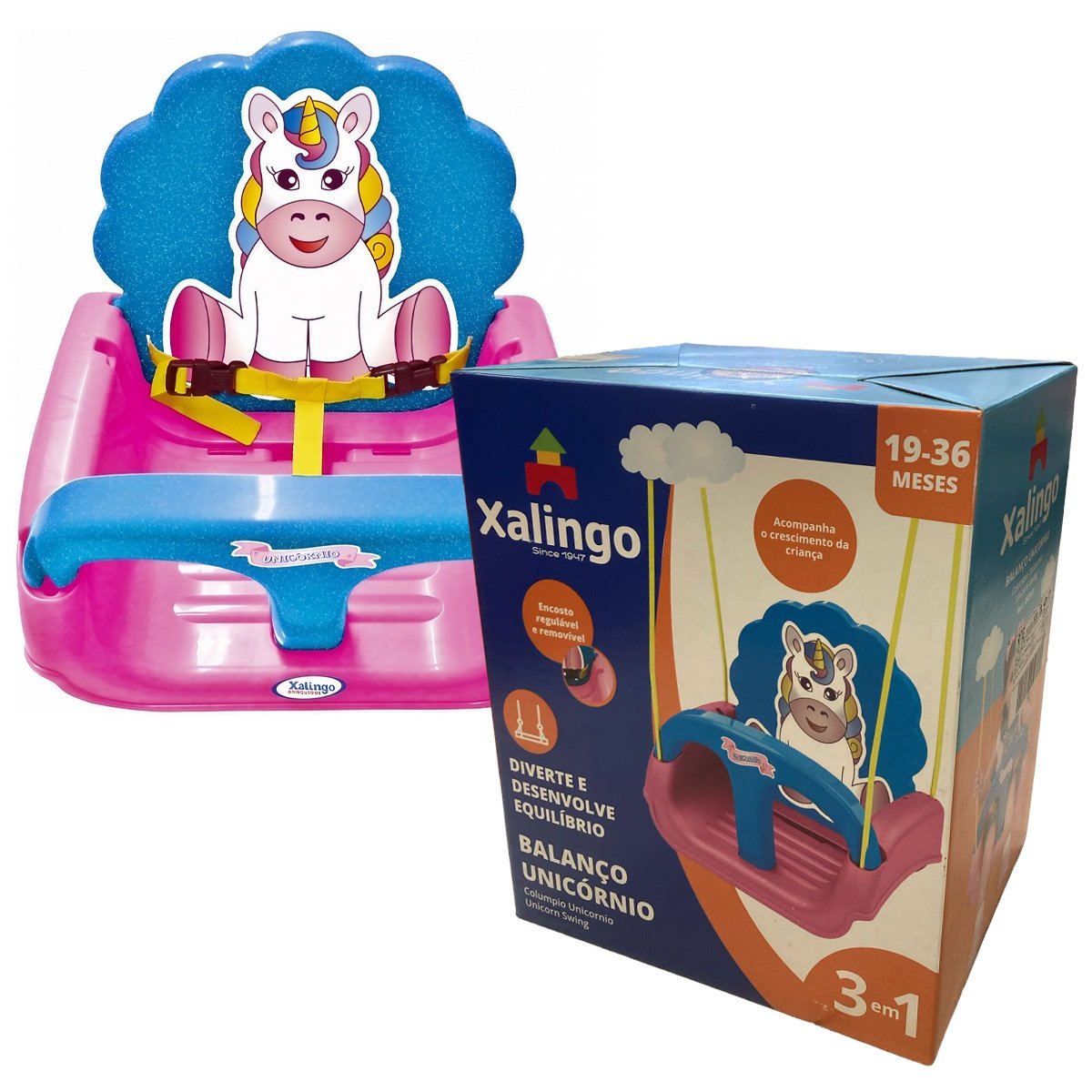 As crianças podem se divertir no embalo do Balanço Unicórnio da Xalingo Brinquedos. Inspirado no Unicórnio, criatura mitológica, diverte e desenvolve o equilíbrio e a coordenação motora. O balanço Unicórnio 3 em 1 injetado acompanha o crescimento da criança, porque pode ser usado com ou sem encosto e barra de proteção. O encosto é regulável, acompanhando cordas em plástico e 2 ganchos para fixação. Indicado para crianças de 19 a 36 meses.