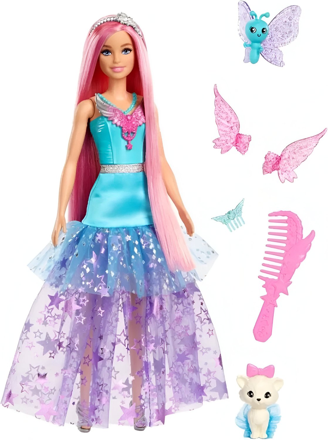 A Barbie "Malibu" Roberts chegou para encantar com seu visual mágico inspirado no filme Barbie Um Toque de Mágica! Ela usa um vestido encantador com saia de tule brilhante, detalhes cintilantes e punhos que lembram asas, trazendo ainda mais fantasia para a brincadeira. Seu cabelo rosa pastel de 17 cm permite diversas criações de penteados e vem com acessórios especiais, como pente, faixa brilhante e grampo decorativo. Para completar a diversão, a boneca acompanha dois adoráveis pets: uma borboleta mágica e um gatinho de estimação com tutu superfofo.