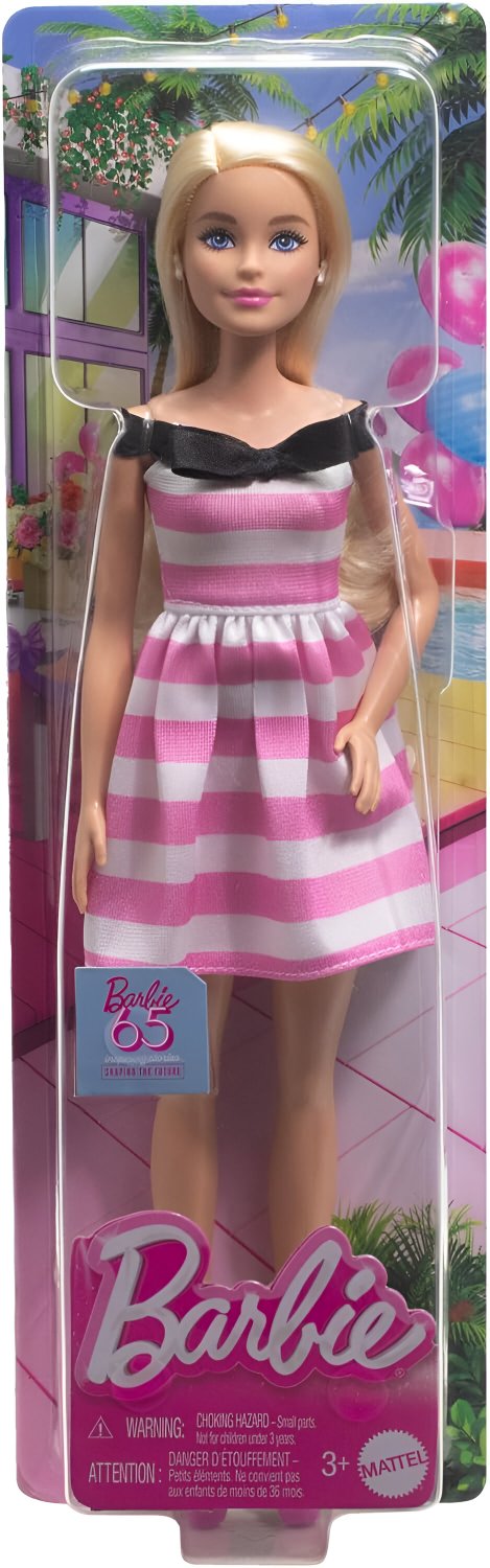 Comemore os 65 anos da Barbie com esta edição especial cheia de charme e estilo! A boneca Barbie Fantasy Vestido Listrado 65th veste um elegante vestido listrado em rosa e branco, complementado por um laço preto no decote para um toque sofisticado. Os brincos de pérolas e as sandálias de salto rosa completam seu visual clássico e atemporal. Perfeita para crianças e colecionadores, esta boneca celebra a trajetória icônica da Barbie, garantindo diversão e inspiração para todas as idades.
