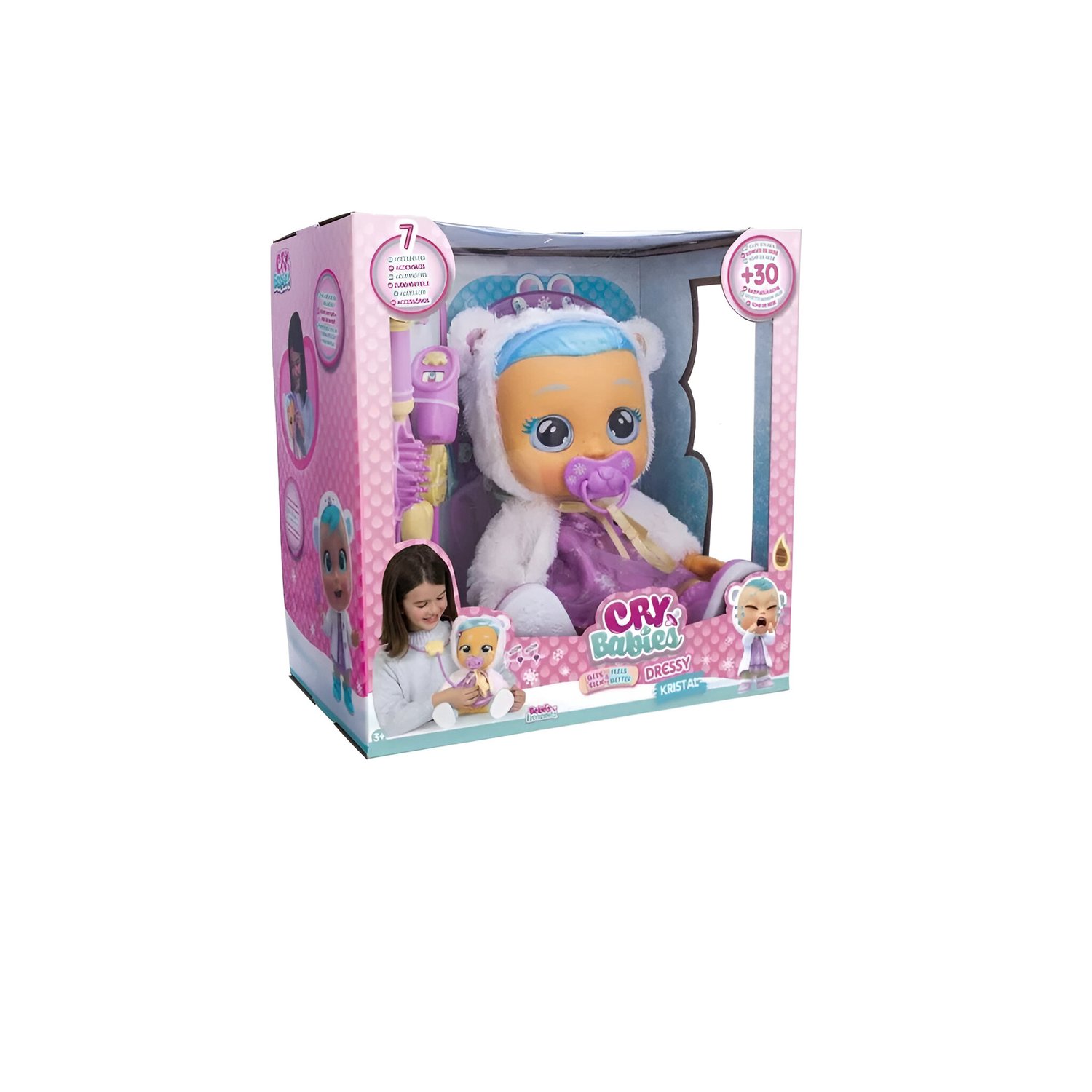 A Dressy Kristal 2.0 da coleção Cry Babies é uma boneca interativa que chora de verdade quando a chupeta é retirada. Além disso, pode "ficar doente", permitindo que as crianças cuidem dela com os acessórios inclusos, como termômetro, xarope e injeção. Seu visual estiloso, com roupas personalizadas e cabelo azul vibrante, torna a brincadeira ainda mais divertida.
