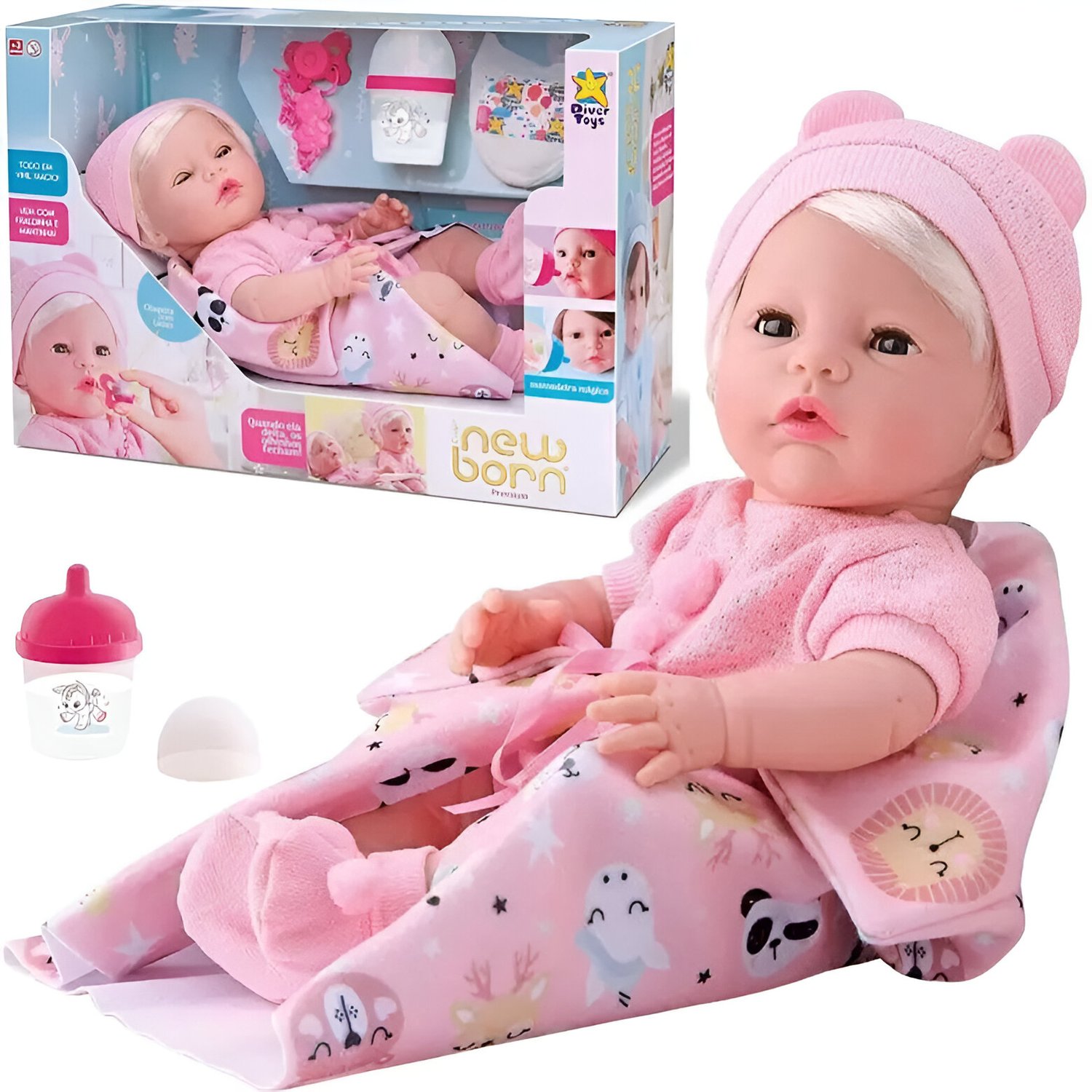 Dê todo o amor e cuidado que sua pequena merece com a Boneca Bebê New Born Premium Menina com Cabelo da Diver Toys! Esta adorável boneca é tão realista que parece um bebê de verdade, com detalhes encantadores como suas dobrinhas fofas e cabelo macio. Confeccionada em vinil de alta qualidade, a boneca New Born Premium é perfeita para brincadeiras que estimulam a imaginação e a interação entre crianças e adultos. Quando deitada, seus olhinhos se fecham, tornando a experiência ainda mais autêntica. Ela vem acompanhada de diversos acessórios para que você possa cuidar dela com muito amor, como uma mamadeira mágica, chupeta com luzes, mantinha, fraldinha, carteirinha de vacinação e certidão de nascimento.