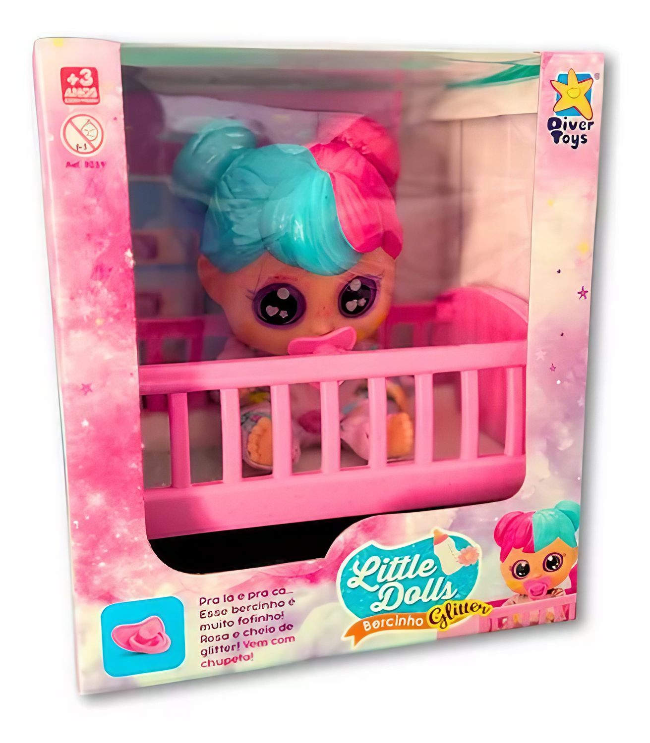 - Acessórios Encantadores: Acompanha uma chupeta e um bercinho brilhante, ambos em plástico.