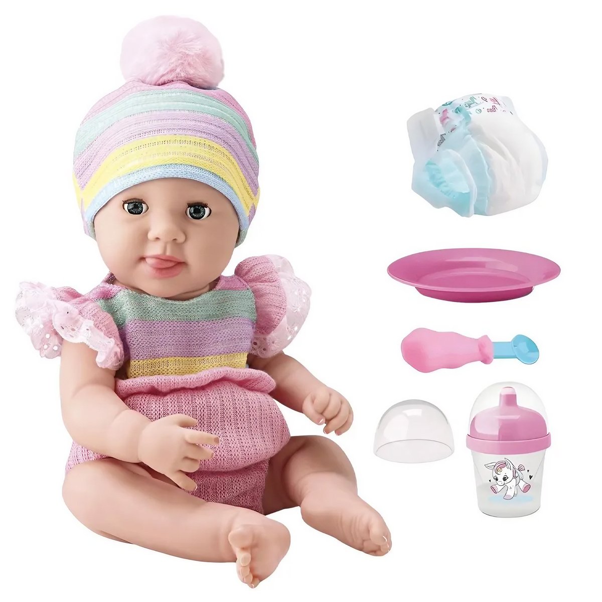 - Acessórios Lúdicos: Inclui mamadeira mágica, fraldinha, colherzinha e pratinho para brincar de papinha.
