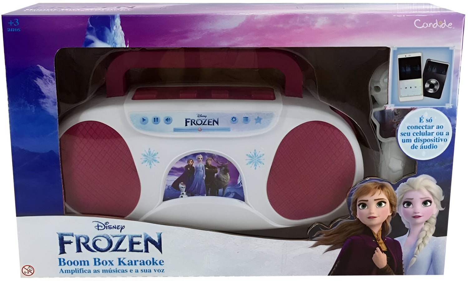 Apresentamos a incrível Boombox Karaoke Frozen! Com esse aparelho de karaokê, as crianças podem se divertir e cantar suas músicas favoritas do universo mágico de Frozen. Equipado com uma função amplificadora, o Boombox Karaoke permite conectar dispositivos de som, como smartphones e tablets, para reproduzir as músicas preferidas da criançada. Assim, elas podem soltar a voz e sentir-se parte dessa aventura congelante ao lado de Anna e Elsa! Além de proporcionar muita diversão, esse karaokê estimula a criatividade, a expressão vocal e a paixão pela música, tornando a brincadeira ainda mais especial!