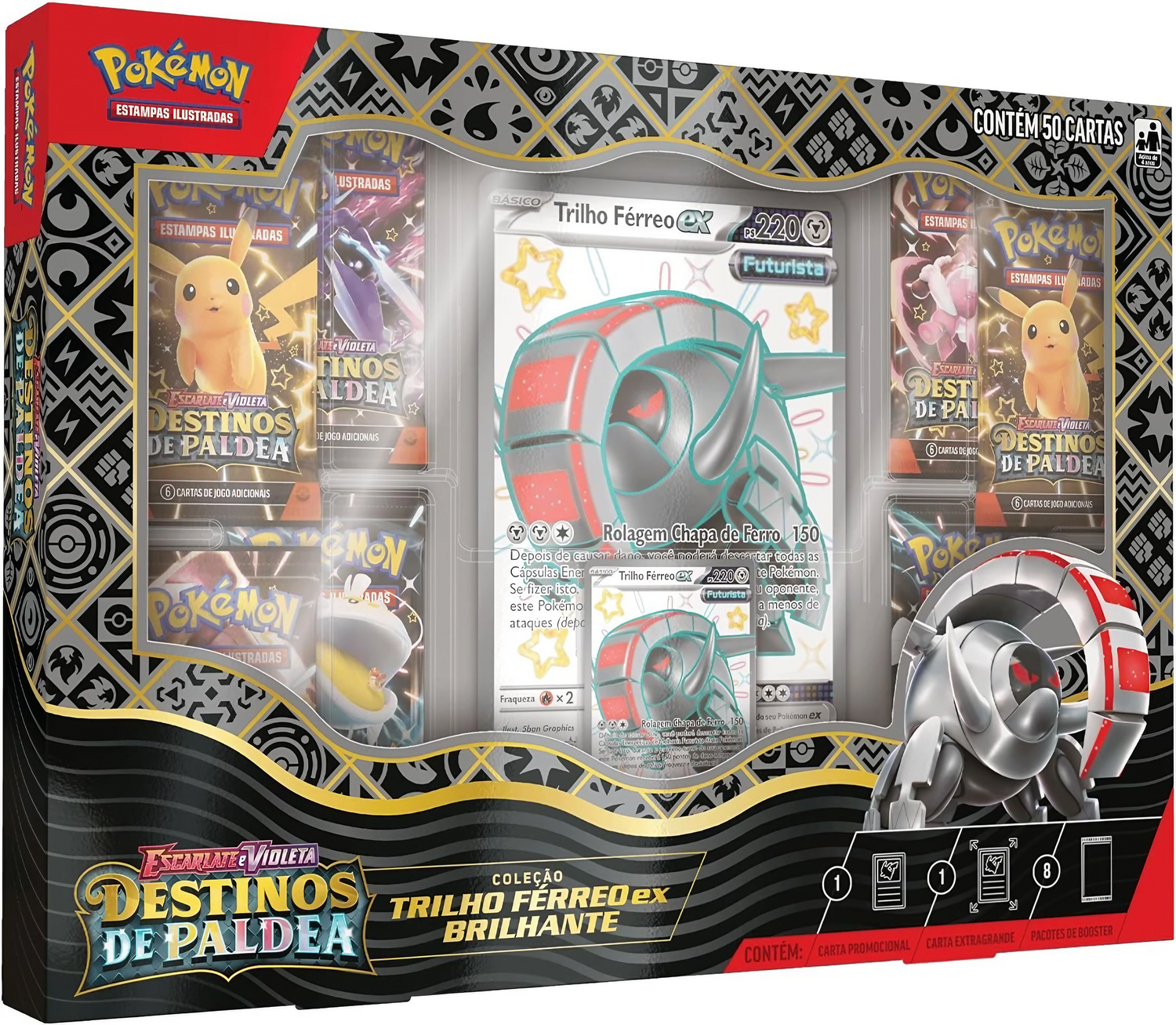 Pokémon Ex Brilhantes sob a luz dos holofotes! Aprecie o poder impressionante dos Pokémon Ex Brilhantes que transcendem os limites do tempo e dos tipos! Com esta coleção, você pode escolher entre a força tremulante de Presa Grande Ex como um Pokémon Ancestral, a determinação de ferro de Trilho Férreo Ex como um Pokémon Futurista, ou o espírito ardente de Charizard Ex como um Pokémon Terra de tipo Escuridão. Descubra outras cartas ainda mais incríveis nos pacotes de booster de Escarlate e Violeta. Destinos de Paldea!