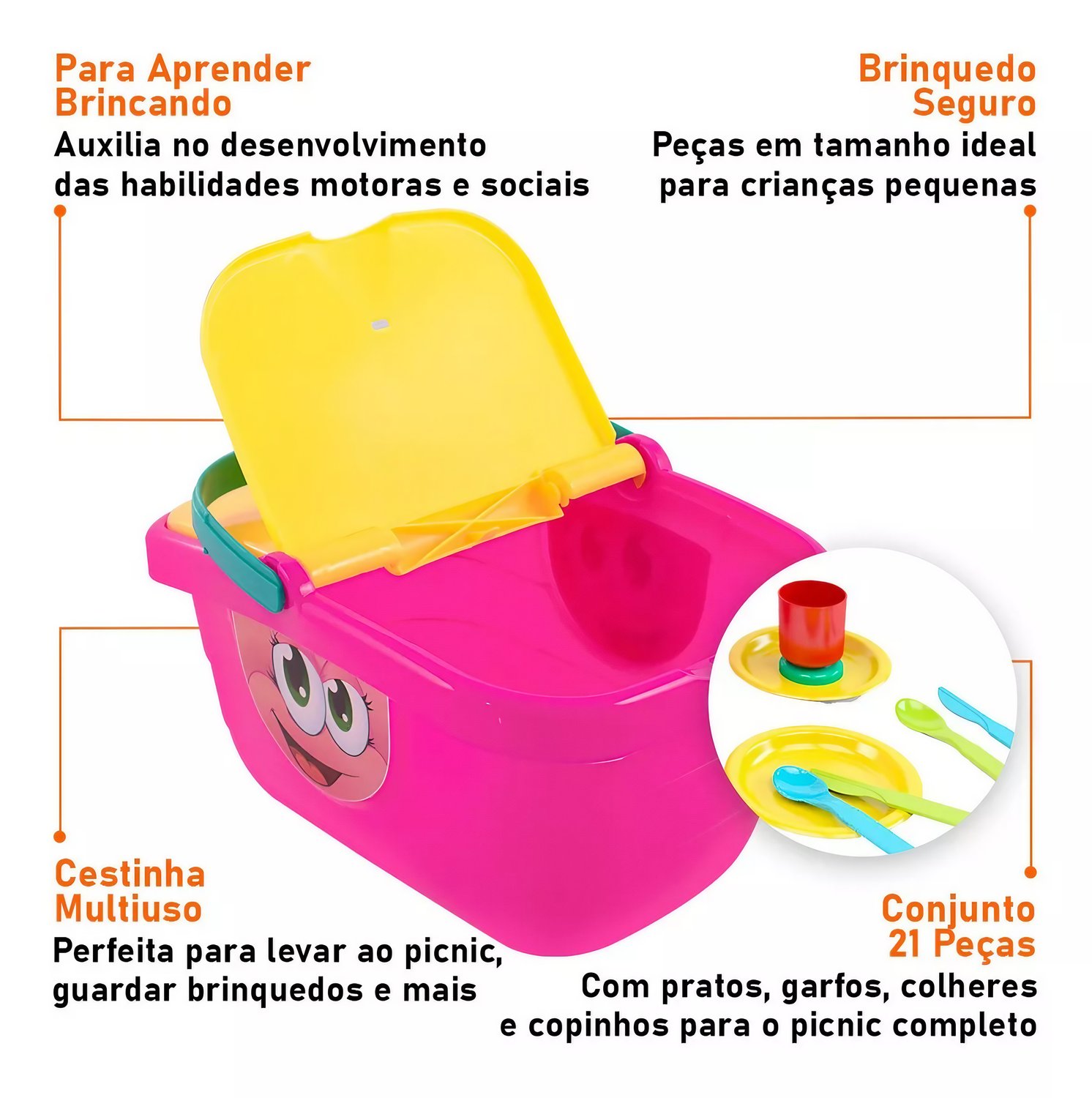 Melhoria das Habilidades Motoras e Concentração: A interação com os itens do picnic ajuda no desenvolvimento das habilidades motoras, foco e concentração das crianças.