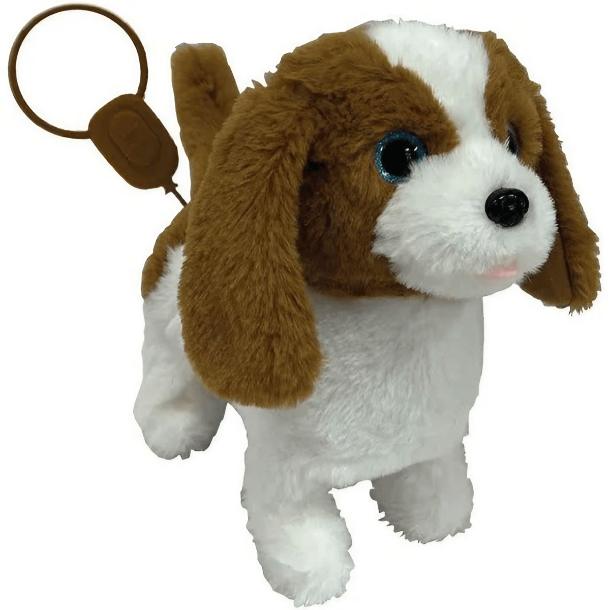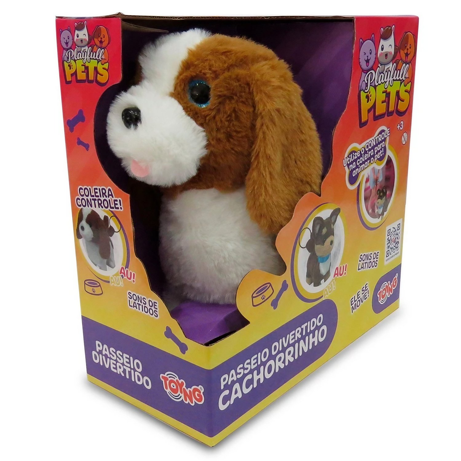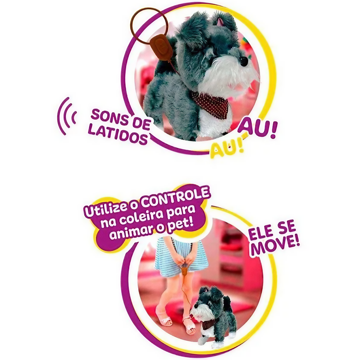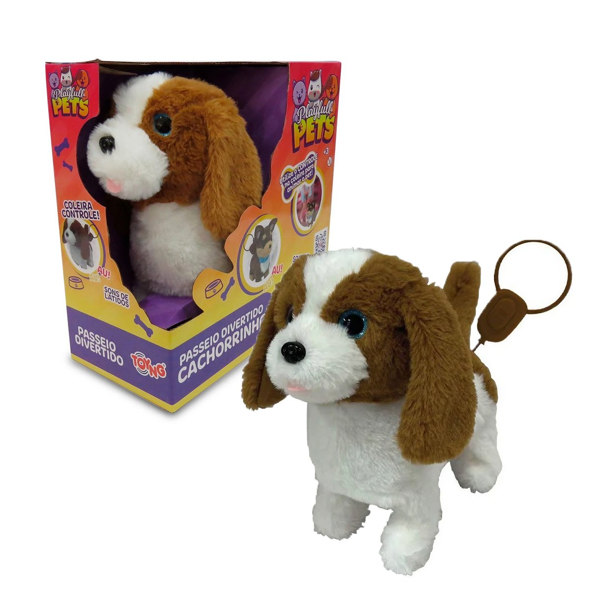 - Cachorrinho de pelúcia que anda, emite sons e tem controle na coleira.
