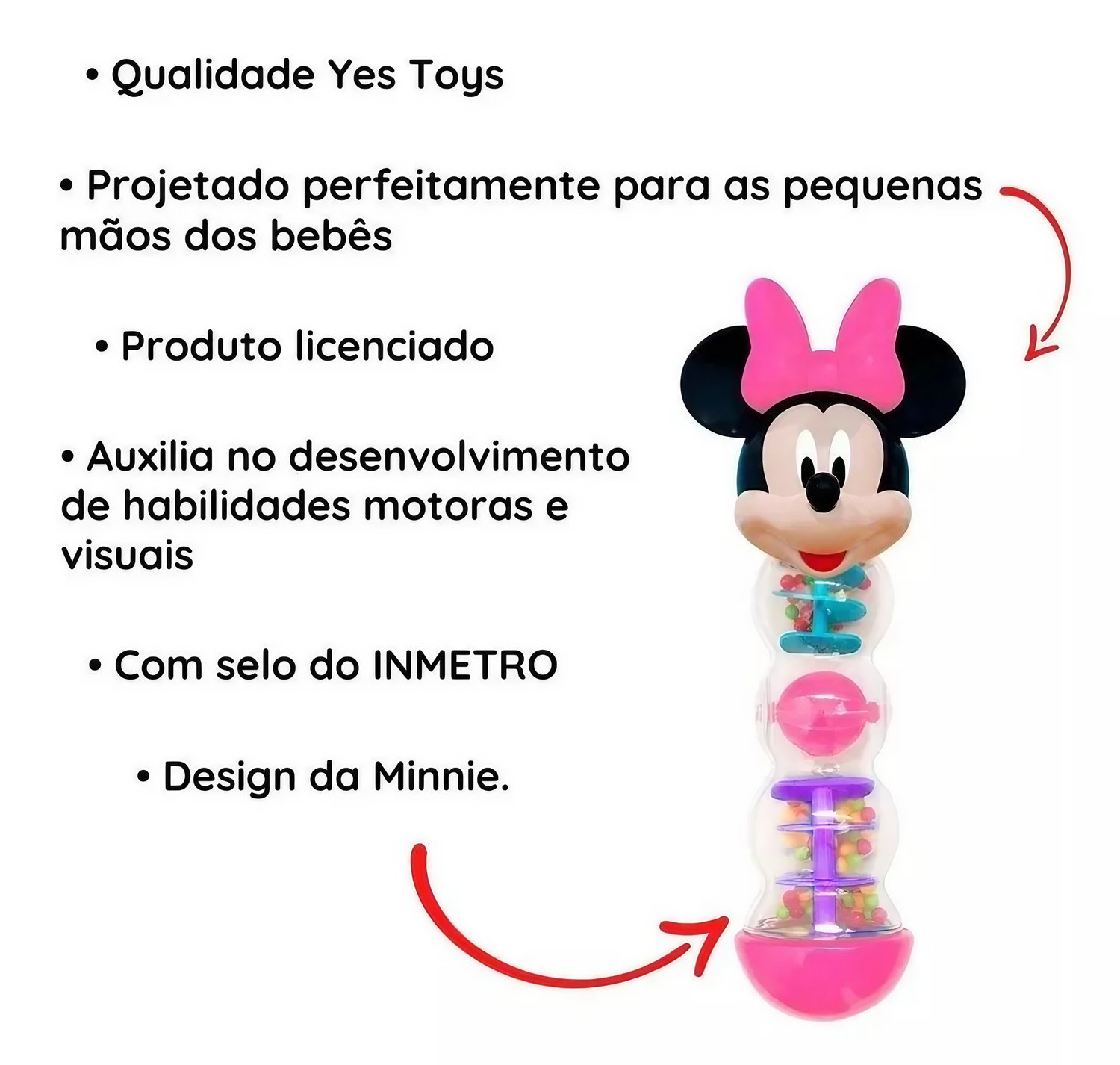 Personagem Disney Baby Minnie: Com a adorável presença da personagem Disney Baby Minnie, o chocalho adiciona um toque de charme às brincadeiras cotidianas.