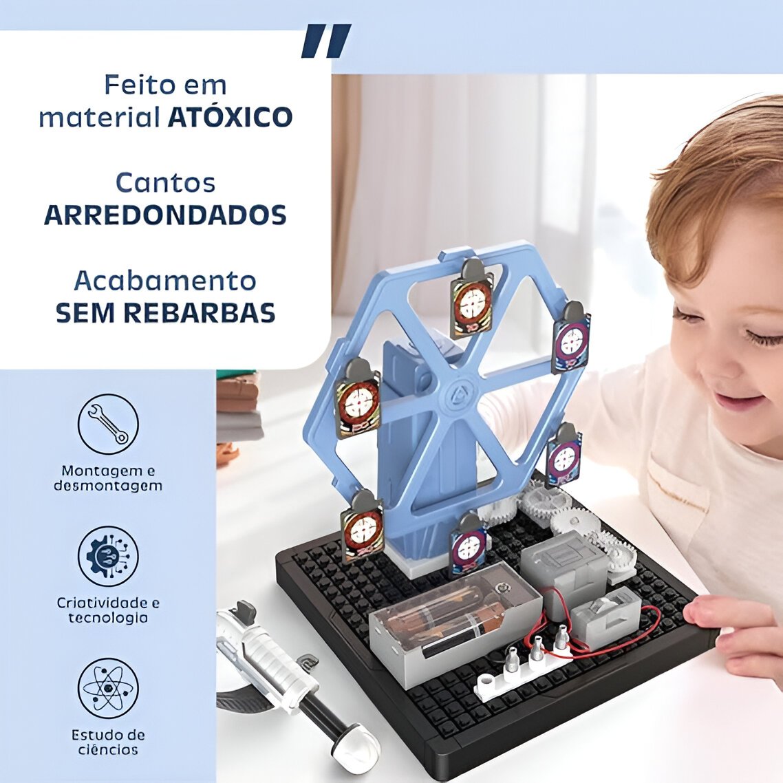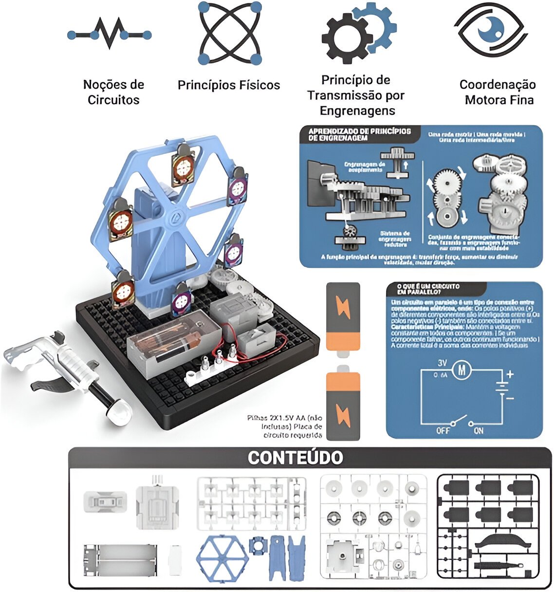 - Kit completo com peças para montar engrenagens, circuitos e fiação.