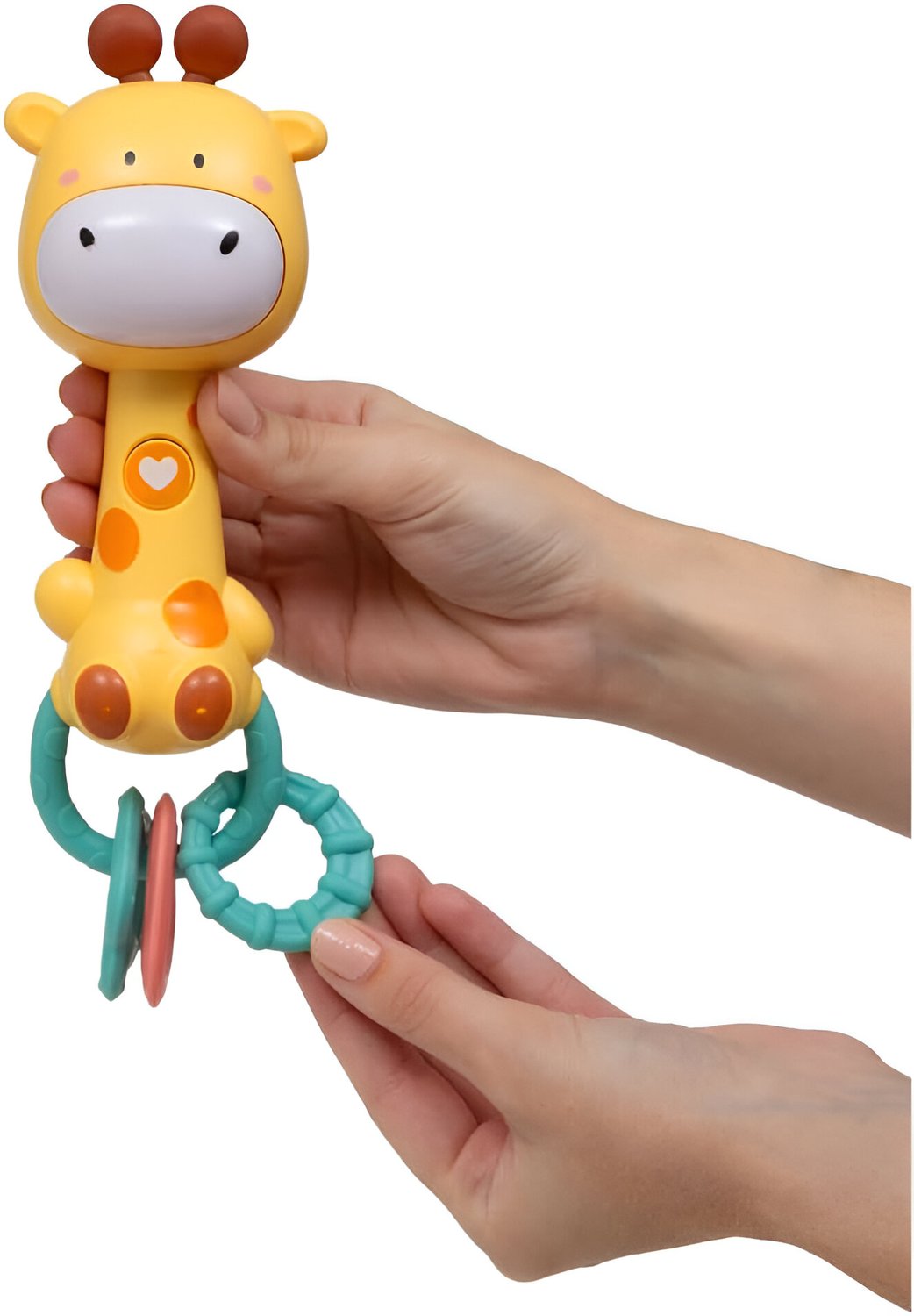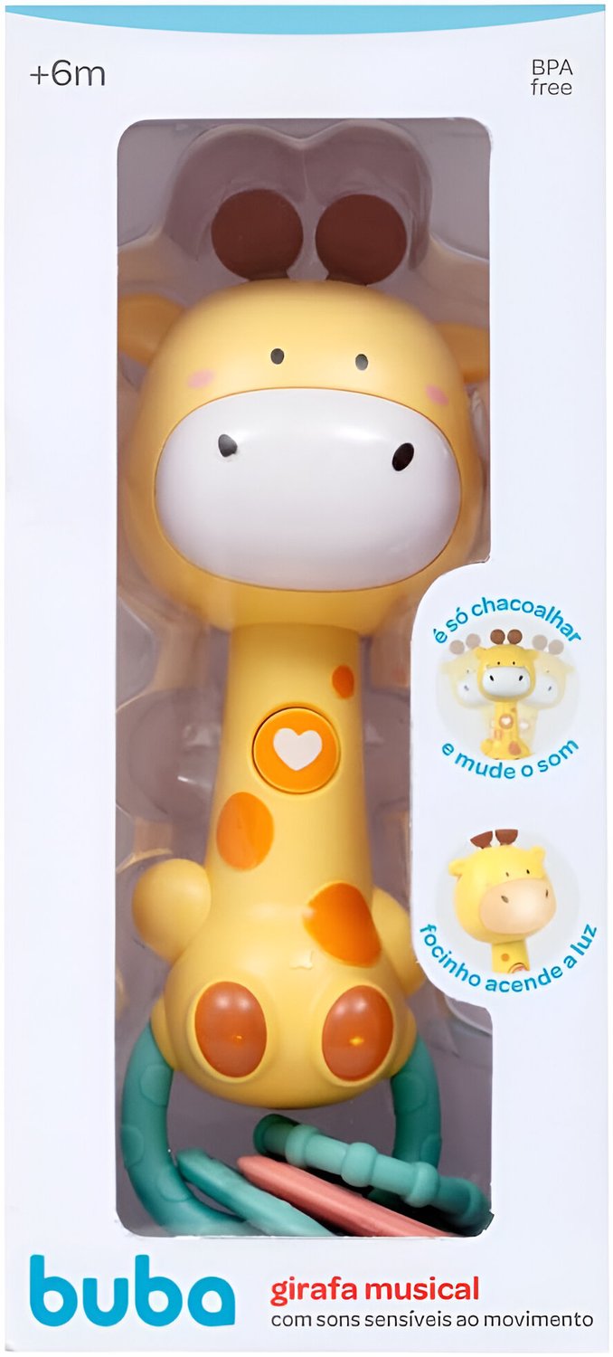 Solta o som! A Girafa Musical da Buba é perfeita para o pequeno descobrir diferentes ritmos e sons de animais. Sensível ao movimento, basta chacoalhar a girafa para criar o próprio ritmo e se divertir com uma variedade de sons. Com luz no focinho e mordedores com texturas, este chocalho vai encantar e estimular a percepção auditiva e o desenvolvimento sensorial do bebê. Um chocalho como você nunca viu!