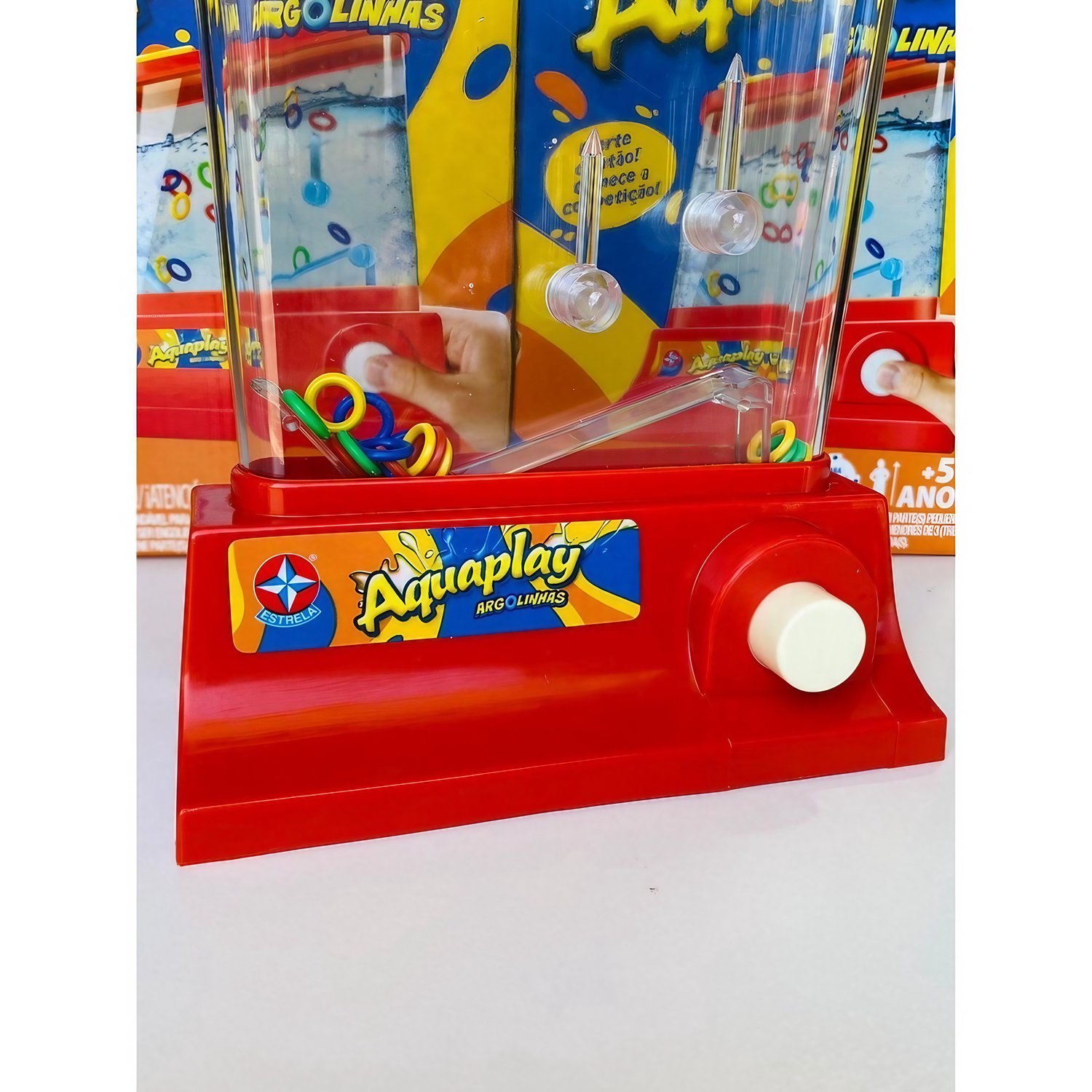 Desafio Aquaplay Argolinha: Reviva a diversão clássica com o objetivo de pressionar e soltar o botão, movimentando a água para encaixar as argolinhas nos bastões.