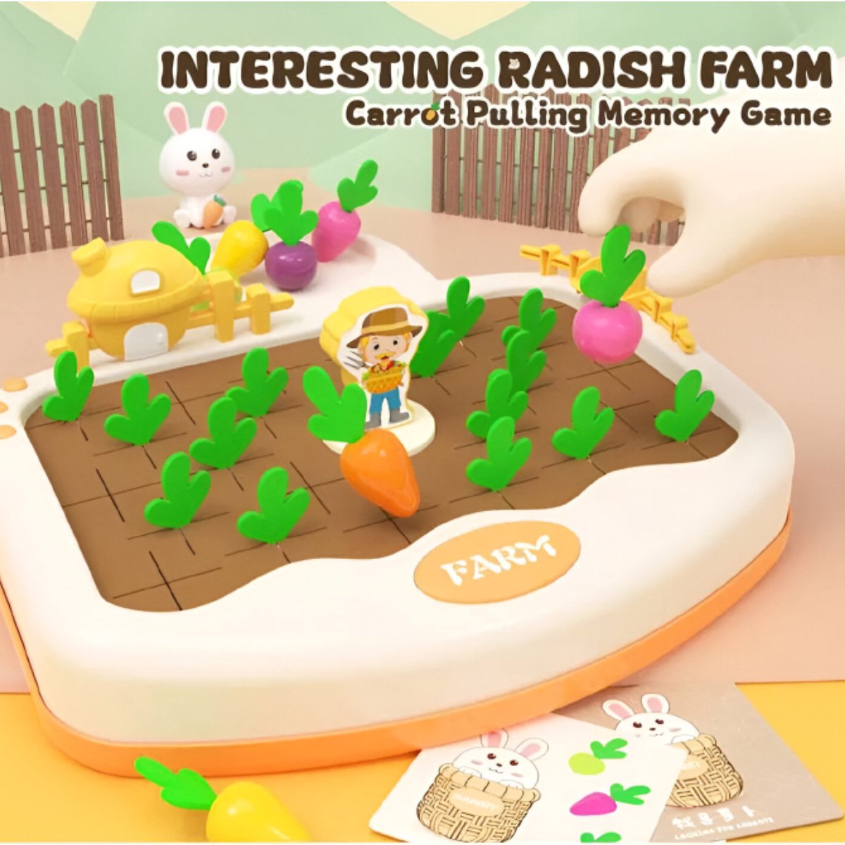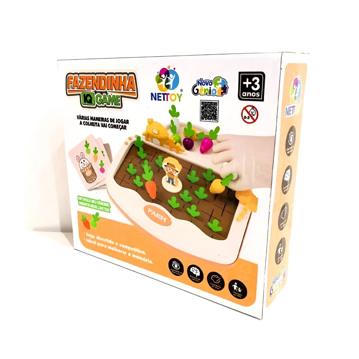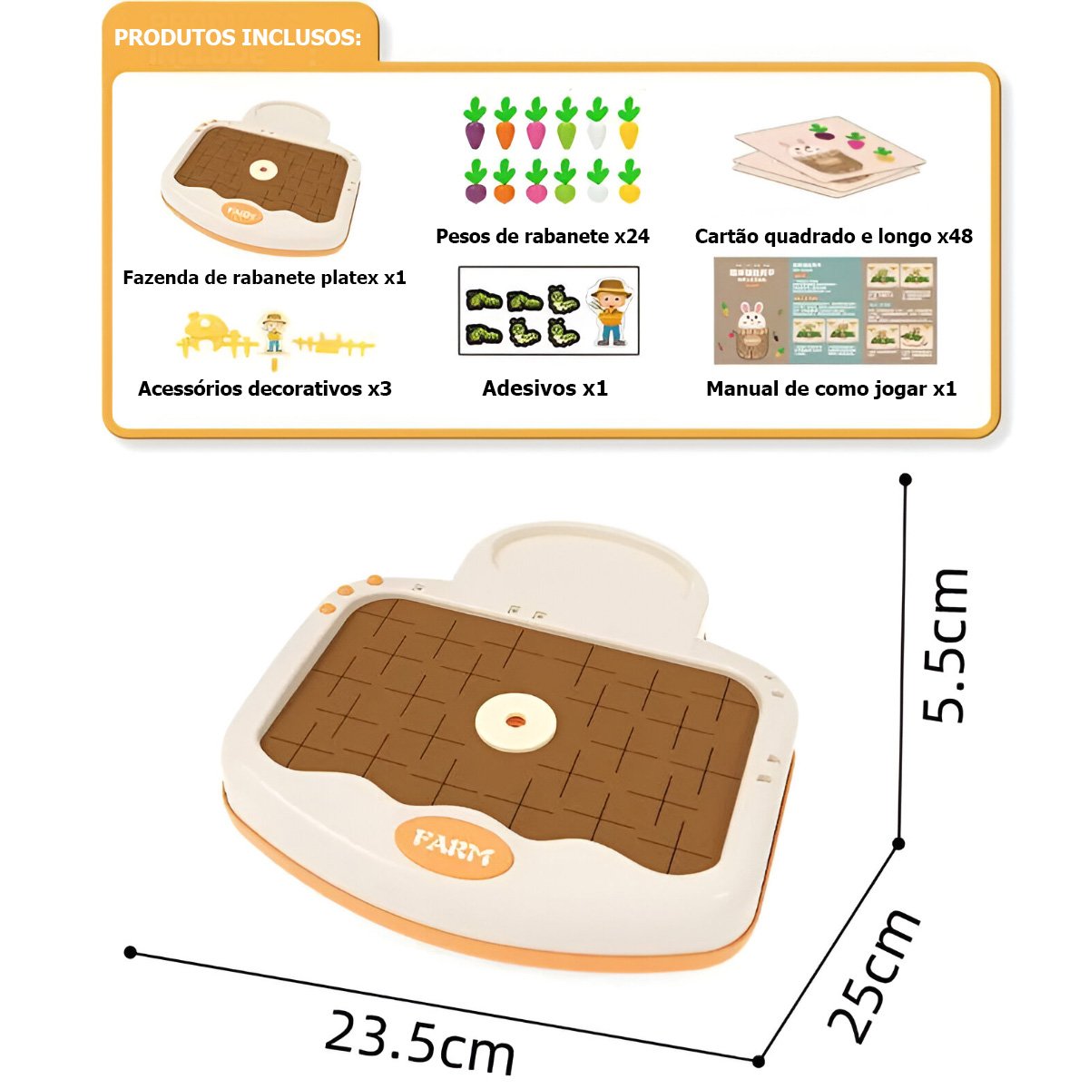 O Desafio da Fazenda é um jogo de memória único e envolvente, ideal para desafiar sua atenção e estratégia enquanto se diverte com seus amigos e familiares. No início do jogo, os jogadores devem plantar todas as cenouras e rabanetes no tabuleiro e, em seguida, coletar as plantas de maneira estratégica para marcar pontos.