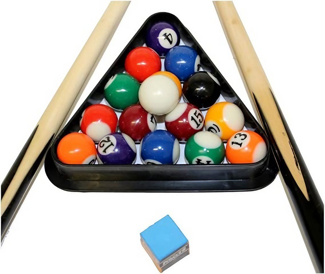 - Jogo Completo: Inclui 16 bolas de acrílico coloridas, dois tacos de madeira, giz e escova.
