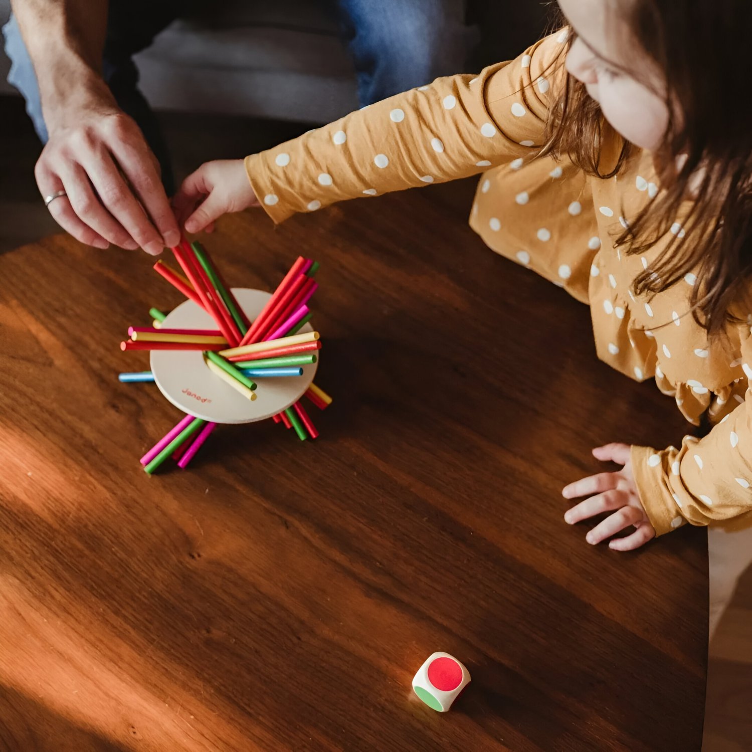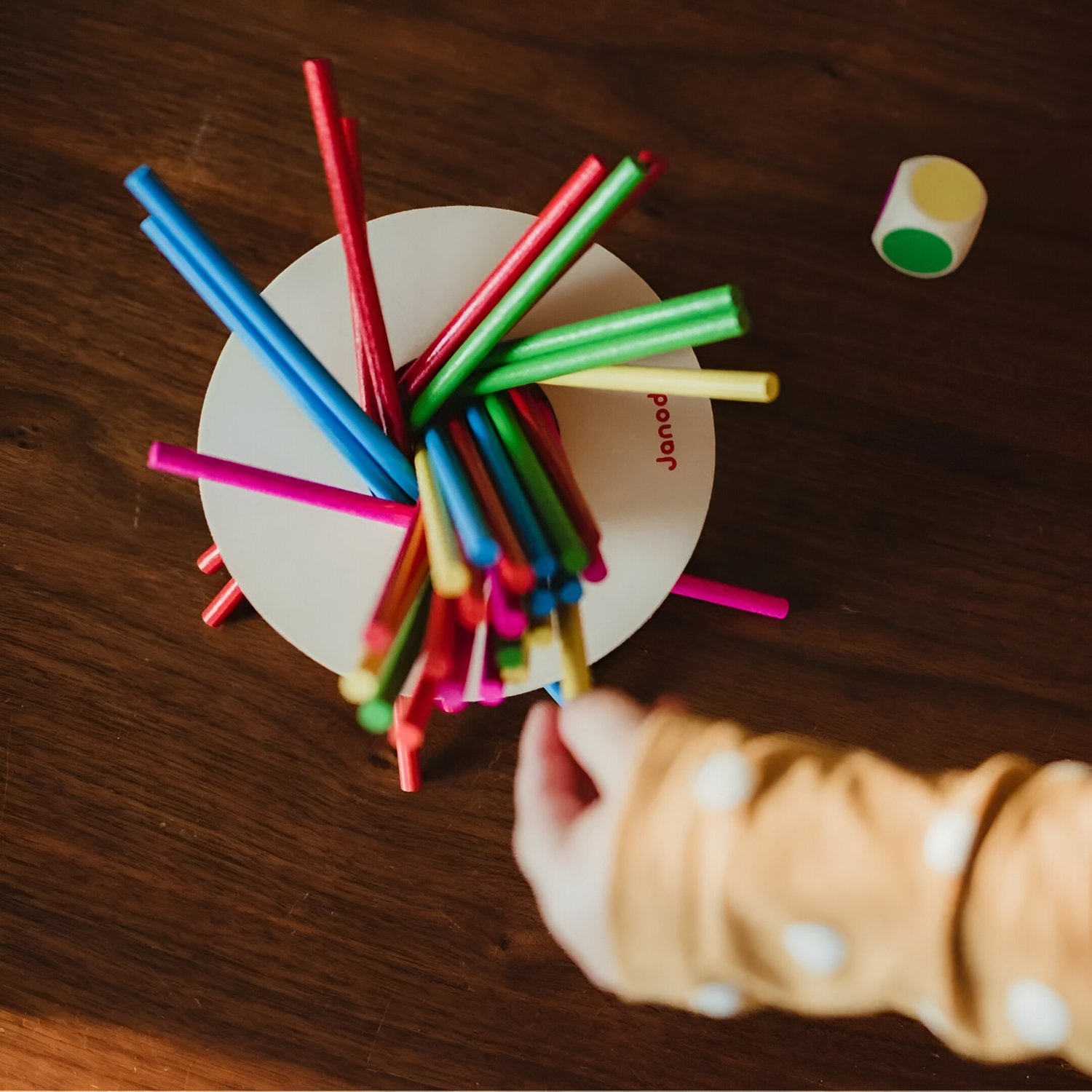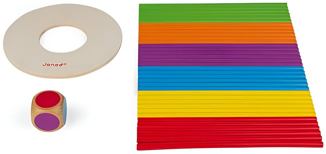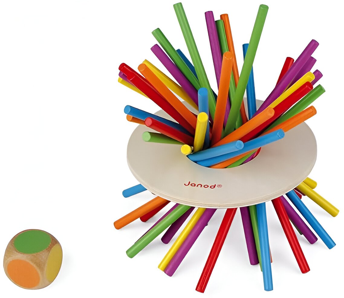 Equilíbrio, estratégia e diversão com o Jogo Pega Varetas de Madeira da Janod! Um desafio emocionante para crianças e toda a família, onde cada movimento conta. Role o dado, retire a vareta certa e mantenha o disco suspenso. Um jogo clássico reinventado com charme e qualidade!
