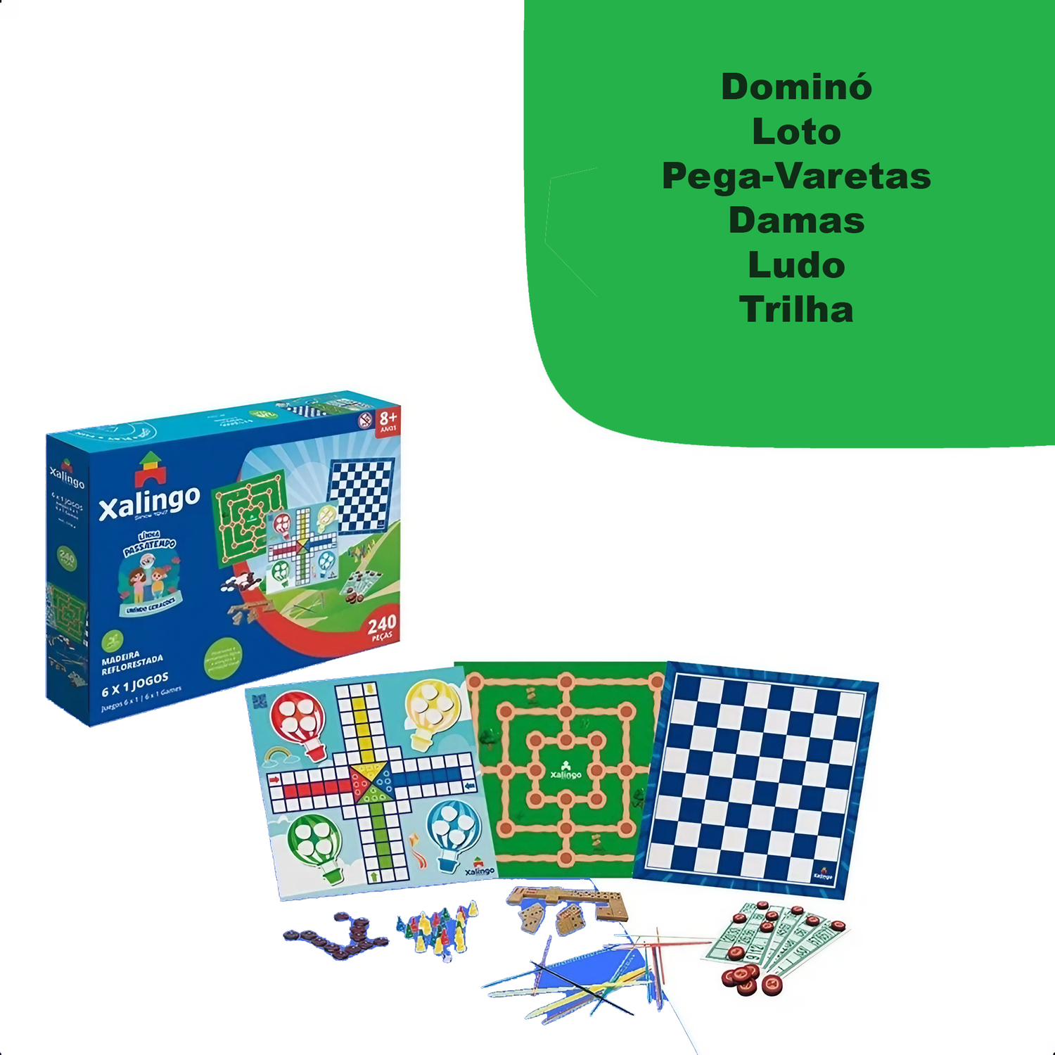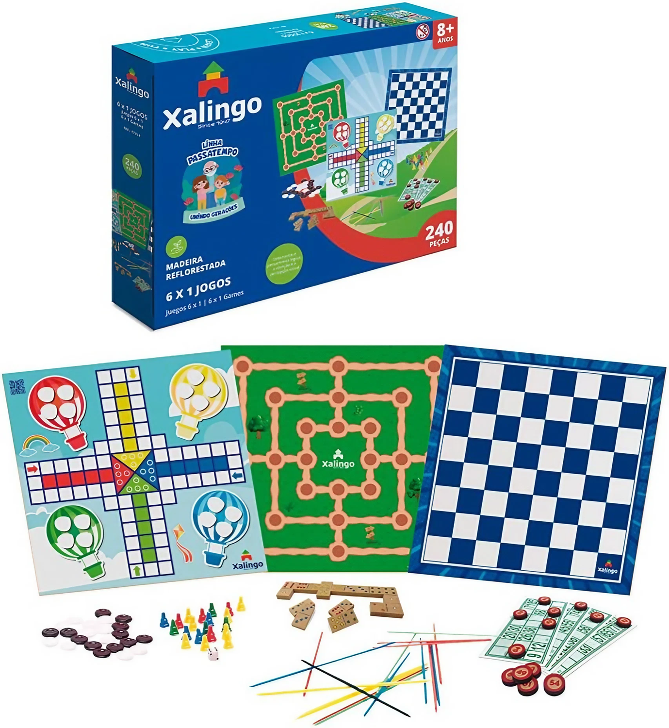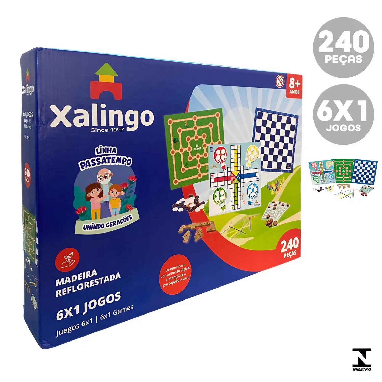 O 6x1 Jogos, da Linha Passatempo da Xalingo Brinquedos, possibilita desenvolver o pensamento lógico, a atenção e a percepção visual, além de poder reunir toda a família para bons momentos de diversão. Com a Linha Passatempo, os momentos de diversão e descontração em família ou com amigos estão garantidos. São 6 jogos dentro de uma mesma embalagem. A família toda pode jogar com dominó, loto, pega-varetas, damas, ludo ou trilha.