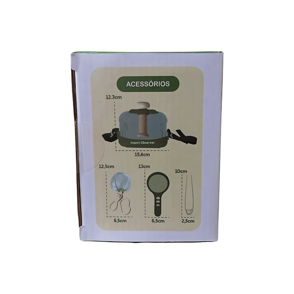 - Acompanha lupa, caixa de insetos, armadilha e pinça.