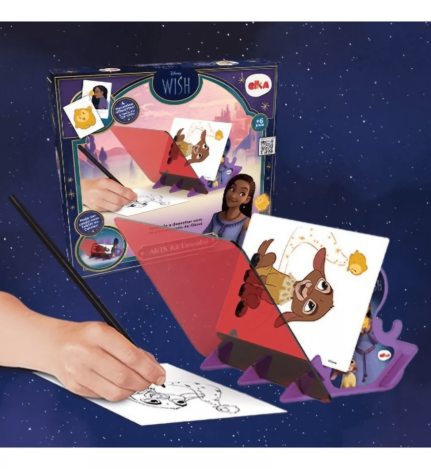 Com o Kit de Desenho Wish Disney, aprender a desenhar ficou ainda mais divertido! Este kit completo vem com peças plásticas para montar a base, além de lápis e papel para iniciar suas criações. Você pode encaixar uma cartela ou o seu celular com a imagem dos personagens do novo filme Wish, da Disney, e, através do reflexo, desenhar no papel.