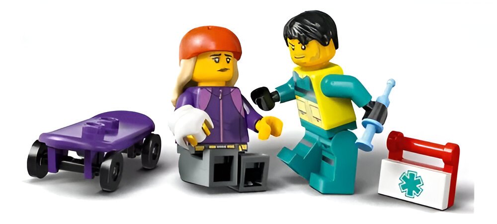 - Inclui cenário de skate, rampa e 2 minifiguras (skatista e paramédico).