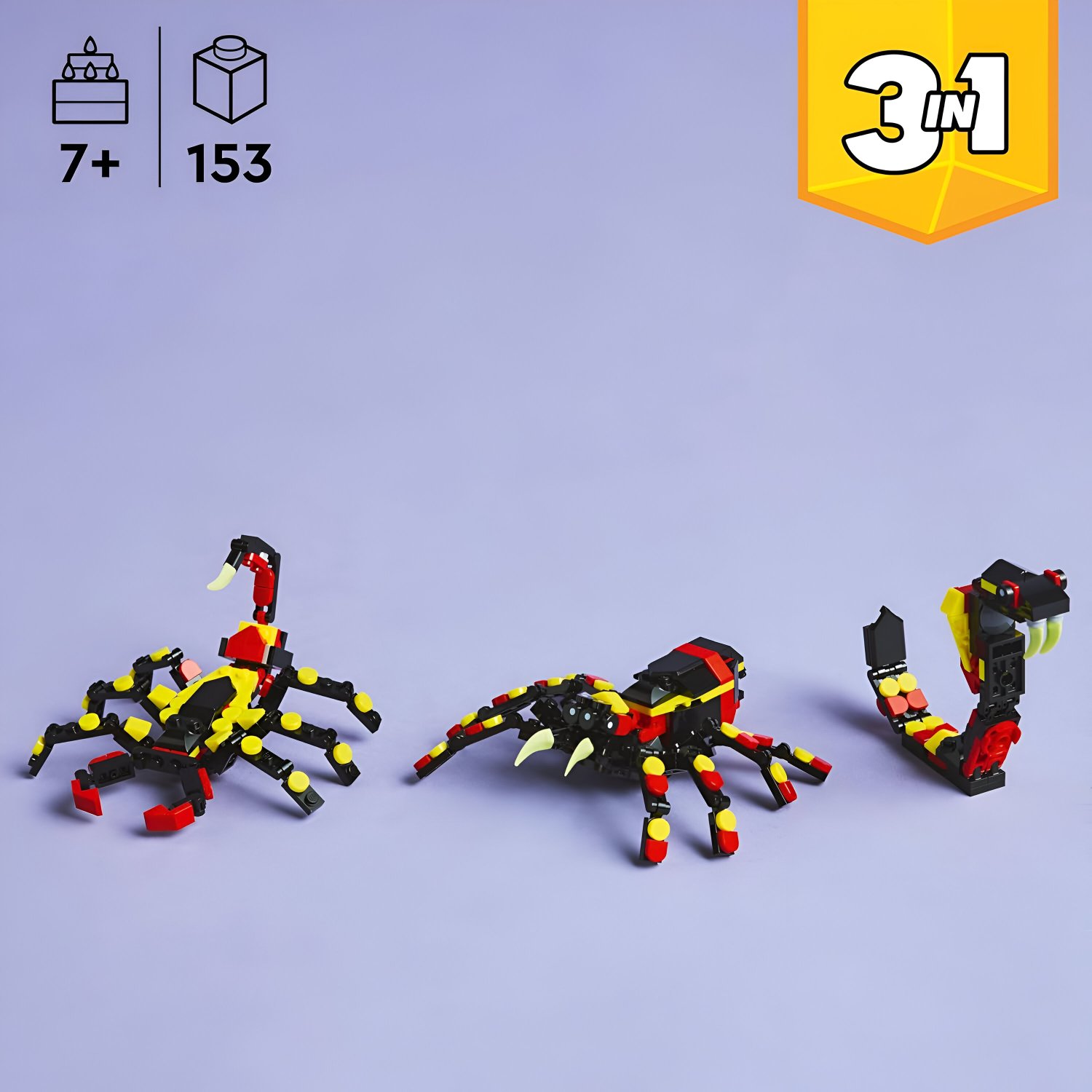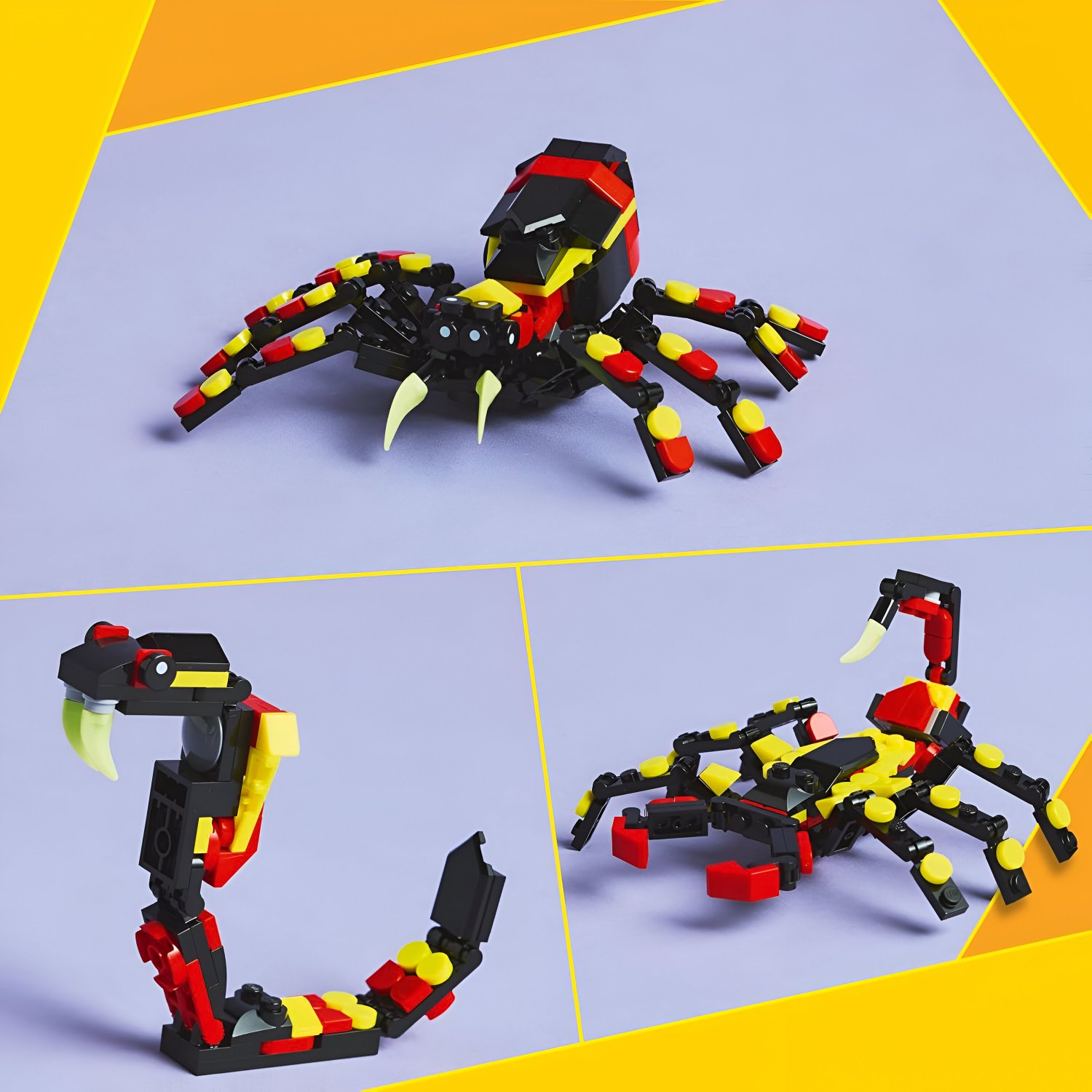 - Construa 3 animais selvagens com o mesmo conjunto: uma aranha, um escorpião ou uma cobra (modelos não podem ser montados ao mesmo tempo).