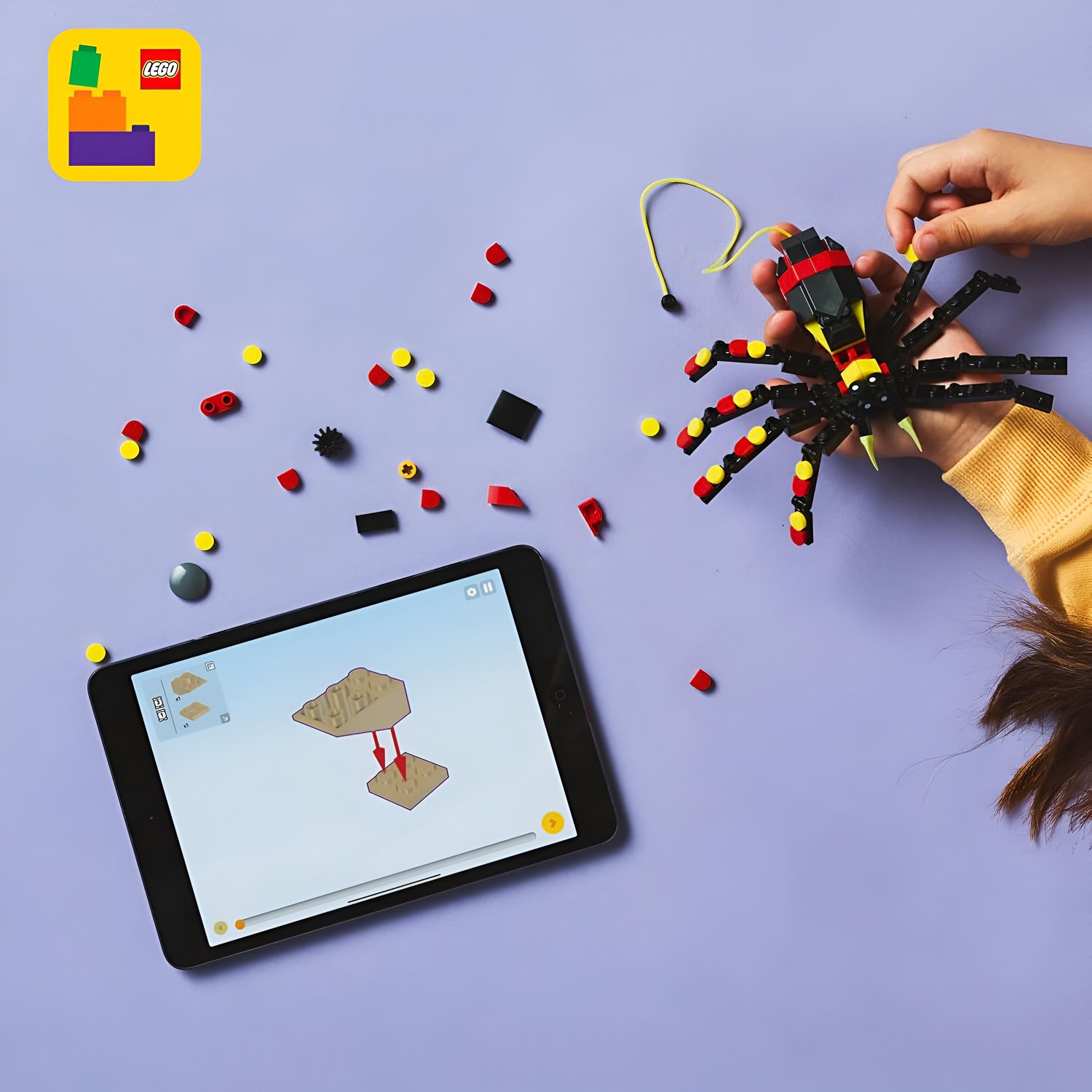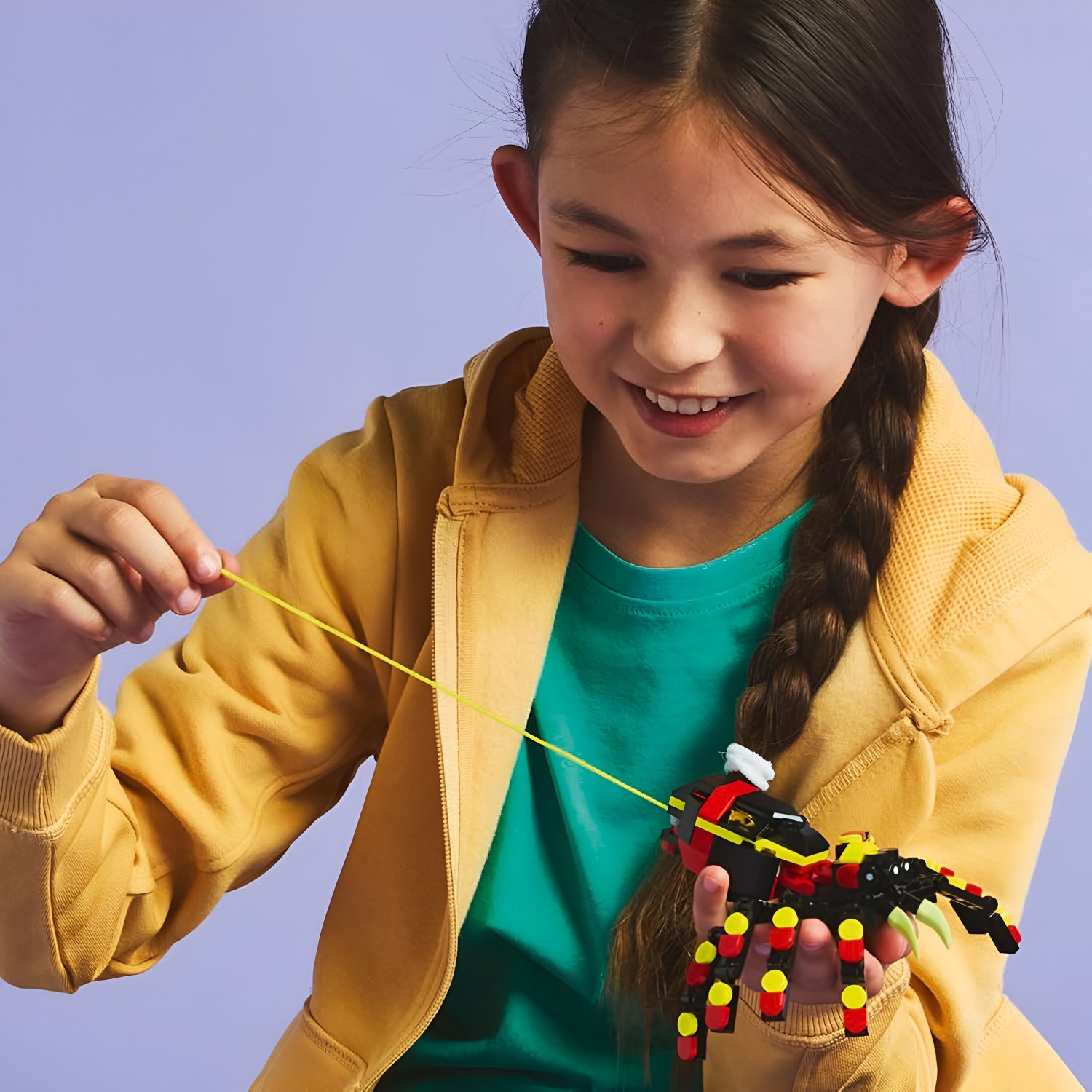 - A aranha vem com uma teia neon retrátil que pode ser pendurada em um tijolo LEGO®.