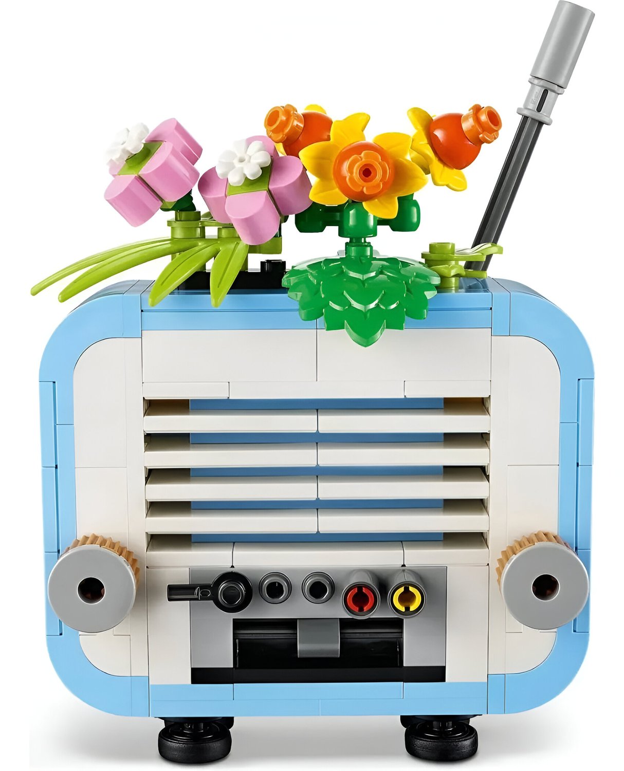 - 3 opções de construção: Toca-discos, rádio de brinquedo ou microfone clássico, todos com flores removíveis.