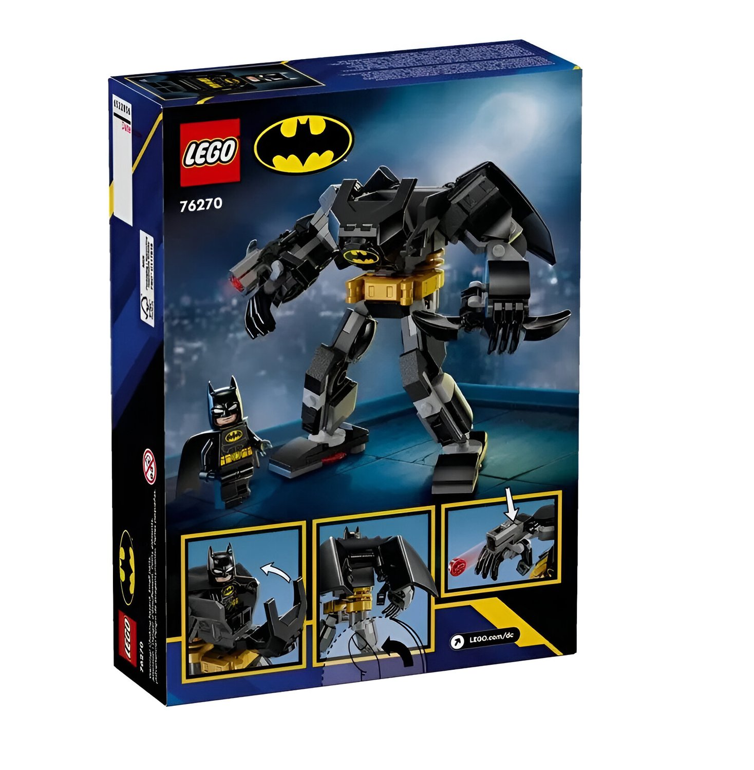 - Batman com armadura robótica: Inclui um mech articulado com cabine que abre para acomodar a minifigura do Batman™, além de acessórios como Batarang™, lançador de pinos e jetpack com capa dupla ajustável.