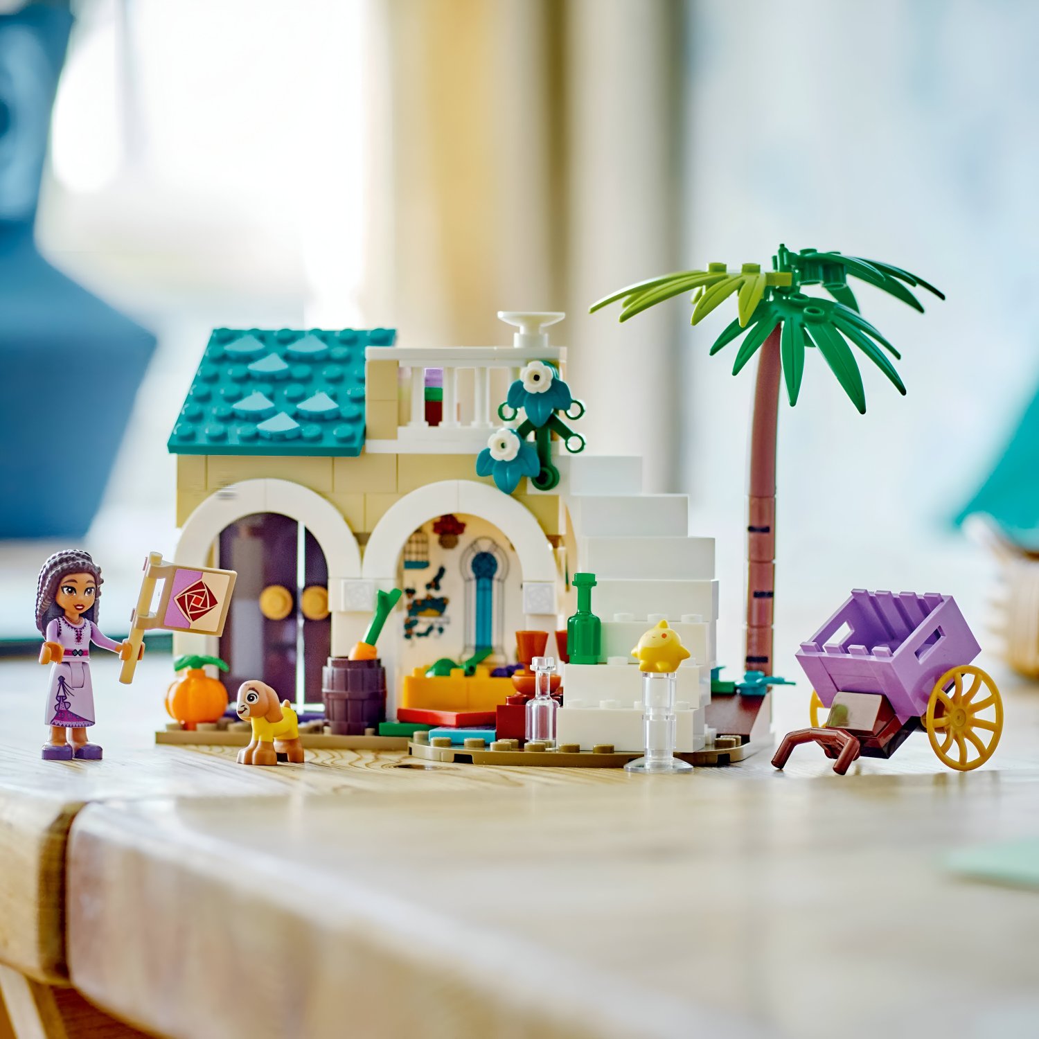 Aventuras na Cidade de Rosas O conjunto inclui um detalhado mercado com escadas e varanda, além de uma sala nos fundos com uma mesa para imaginar refeições e reuniões. As crianças podem também explorar o carrinho de mercado, tornando as brincadeiras ainda mais interativas e divertidas. A miniboneca Asha e as duas figuras LEGO Disney completam o cenário para histórias envolventes e criativas.