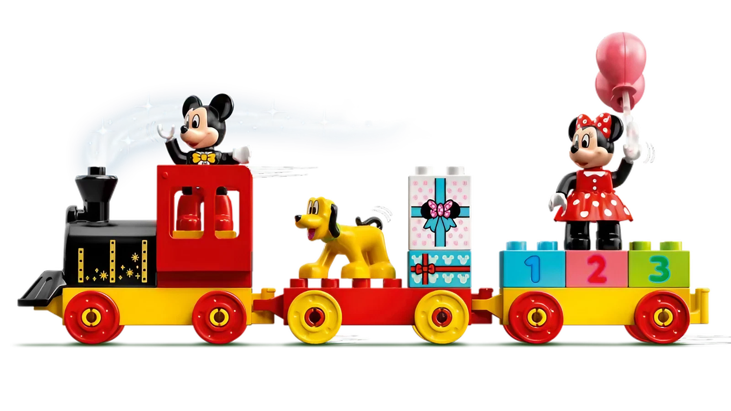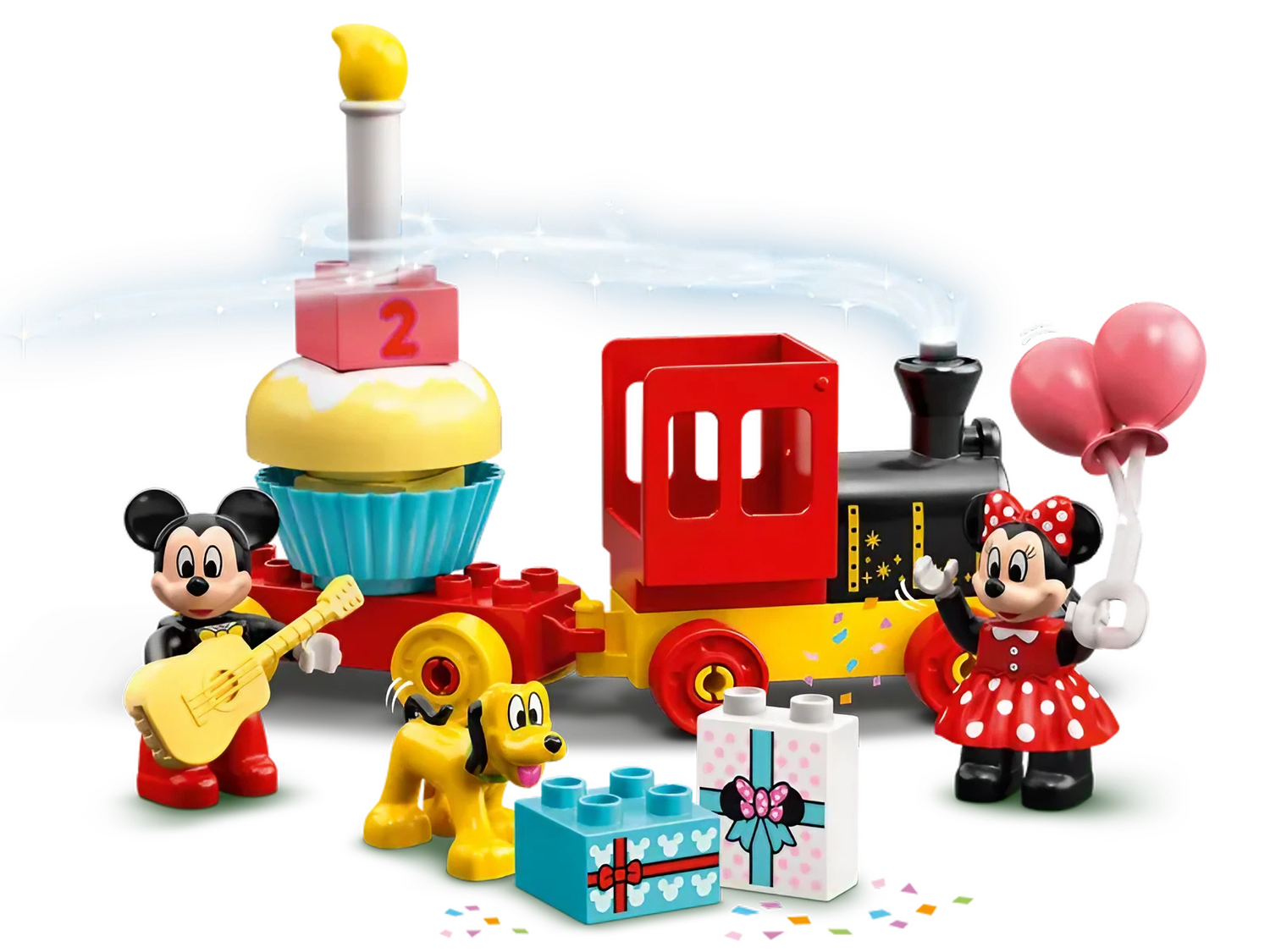 Festeje o aniversário de um bebê com muito estilo com o encantador LEGO® DUPLO® | Disney - O Trem de Aniversário do Mickey e da Minnie! Este conjunto adorável é repleto de atividades de desenvolvimento e inclui personagens favoritas da Disney. Os bebês podem se juntar ao Mickey Mouse, Minnie Mouse e Pluto enquanto viajam no trem de aniversário, parando para brincar e aprender com as diversas atividades a bordo.