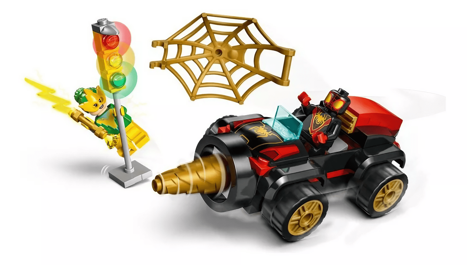 Inspirado em Spidey e seus surpreendentes amigos, da Disney+, este conjunto inclui um carro empurrável do Homem-Aranha com uma seção frontal giratória, além de uma minifigura do Miles Morales e uma minifigura do Electro. O brinquedo vem com um chassi para iniciantes, facilitando o processo de construção com instruções intuitivas apresentadas de forma visual e colorida.
