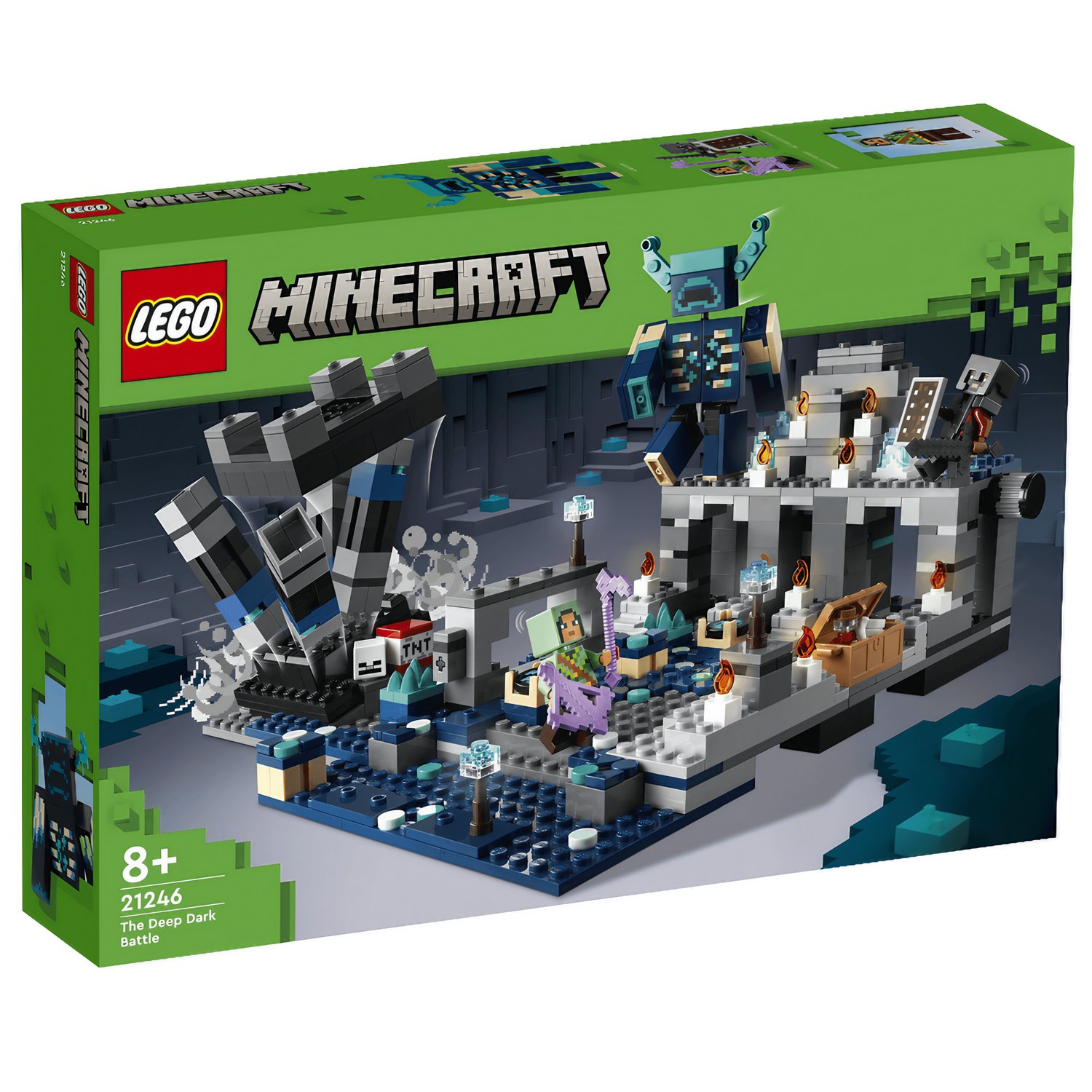 O conjunto Lego Minecraft A Batalha Escura Profunda (21246) leva os jogadores maiores de 8 anos em uma aventura cheia de elementos clássicos do jogo: exploração, escavação e explosões. As crianças podem levar seus heróis de Minecraft, o Cavaleiro Balestreiro e o Cavaleiro de Netherita, em uma aventura cheia de ação por uma das localizações mais desafiadoras do jogo. Equipados com armadura e armas, eles exploram uma cidade antiga e mineram recursos preciosos. Ativado por uma maçaneta giratória, um Warden surge de dentro da ardósia para impedi-los. Durante a batalha, os jogadores podem ligar uma chave para ativar uma grande explosão. Entre as ruínas há um baú que contém itens preciosos: um osso, uma poção de cura e 2 bolas de neve.