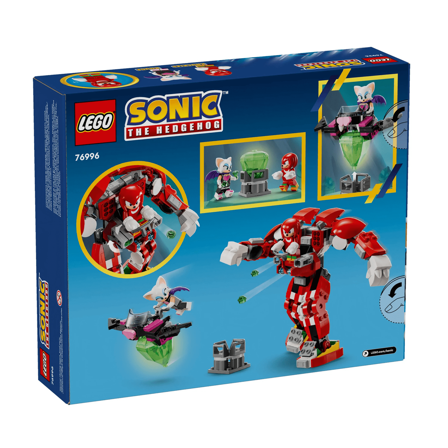 Fãs de Sonic, meninos e meninas com mais de 8 anos, podem viver aventuras divertidas com o conjunto de brinquedos LEGO® Sonic the Hedgehog™ Knuckles' Guardian Mech (76996). Inspiradas nas aventuras de Sonic e de outros personagens de videogame, as crianças criam missões intermináveis para Knuckles e Rouge enquanto constroem o cenário e depois encenam maneiras criativas de roubar e recuperar a Master Emerald com o planador e o robô.