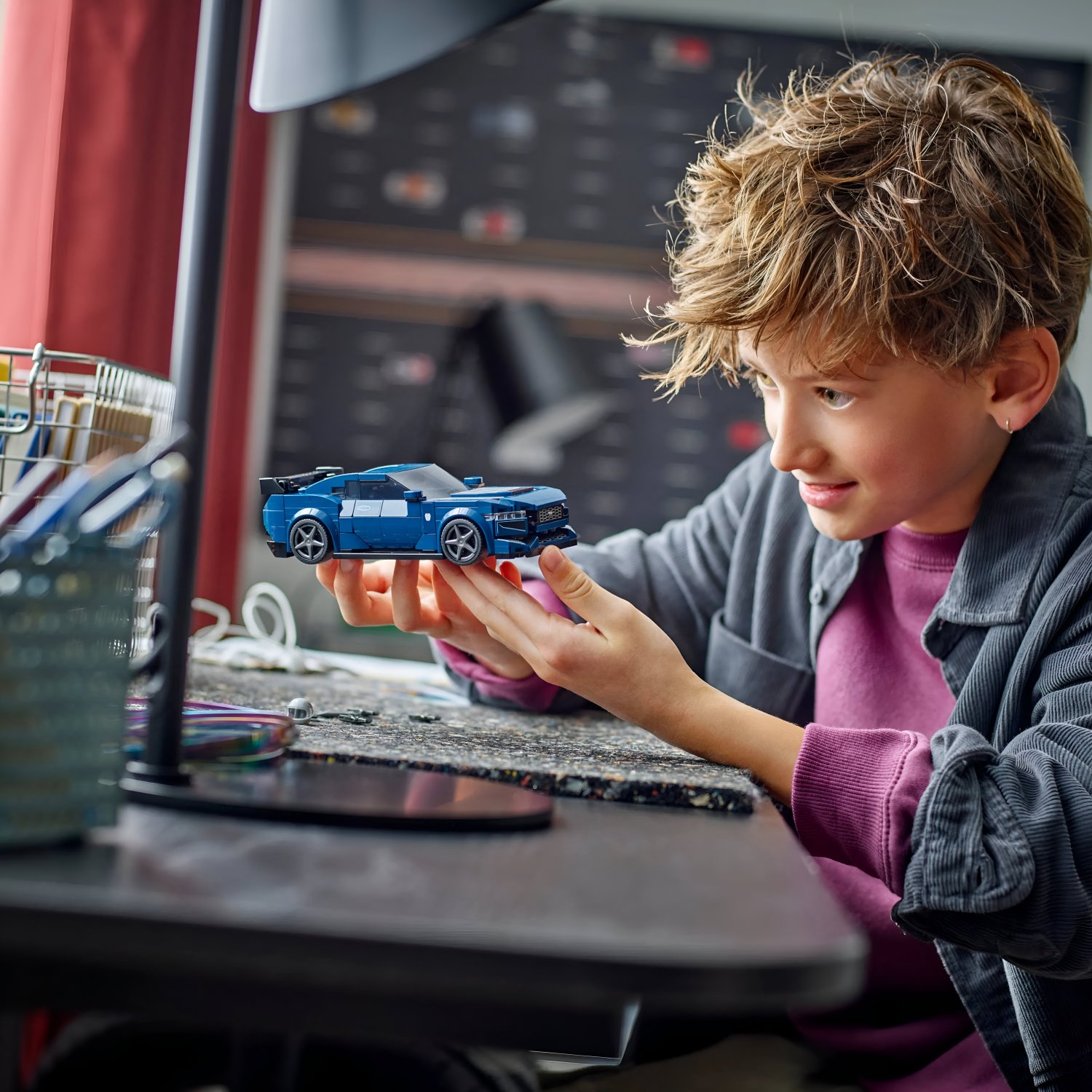 O LEGO® Speed Champions Ford Mustang Dark Horse Sports Car é uma recriação fiel do icônico Mustang americano, perfeito para crianças a partir de 9 anos e entusiastas de carros. Este modelo impressionante oferece uma experiência divertida de colecionar, construir, exibir e encenar aventuras emocionantes com um carrinho de brinquedo azul.