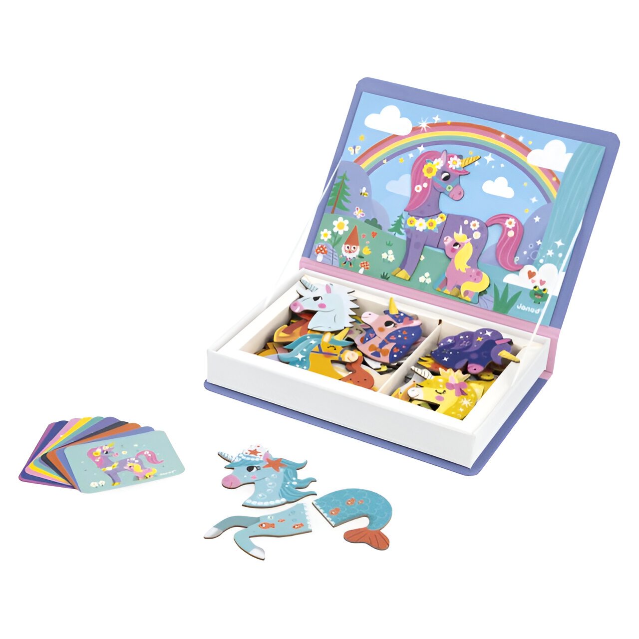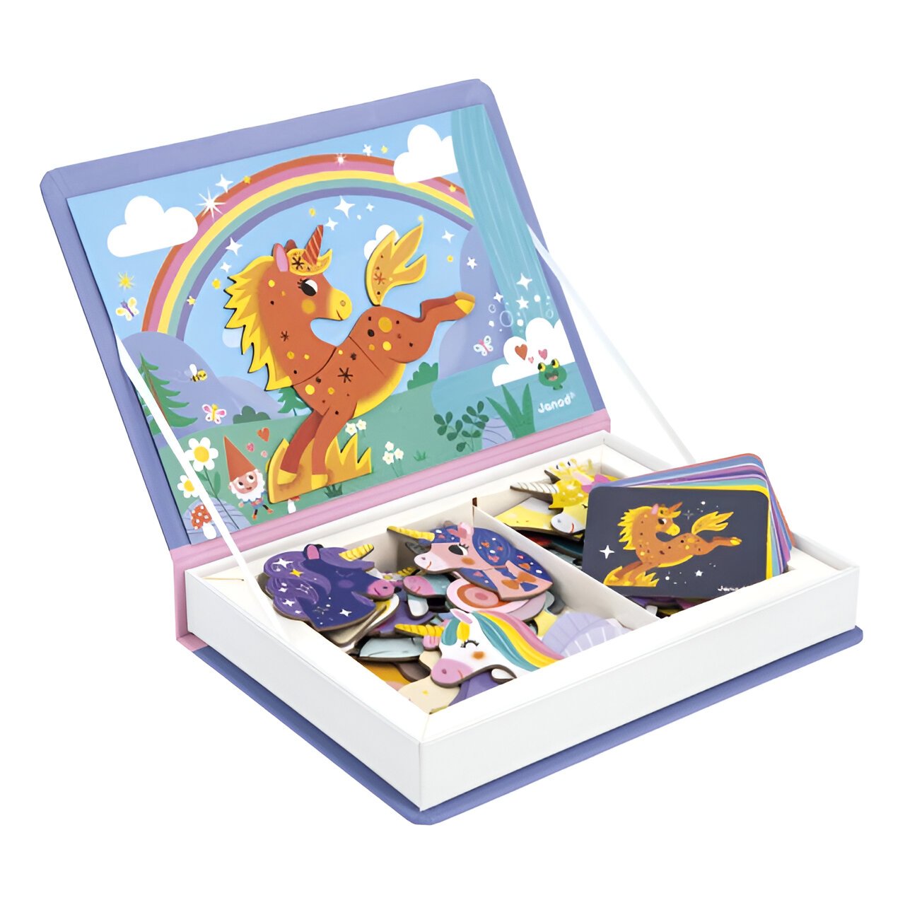 Entre no mundo encantado do Livro Magnético Unicórnios da Janod! Um brinquedo educativo e mágico que estimula a imaginação das crianças de 3 a 8 anos. Perfeito para recriar cenas cheias de fantasia ou inventar novas histórias encantadas com unicórnios e criaturas mágicas.