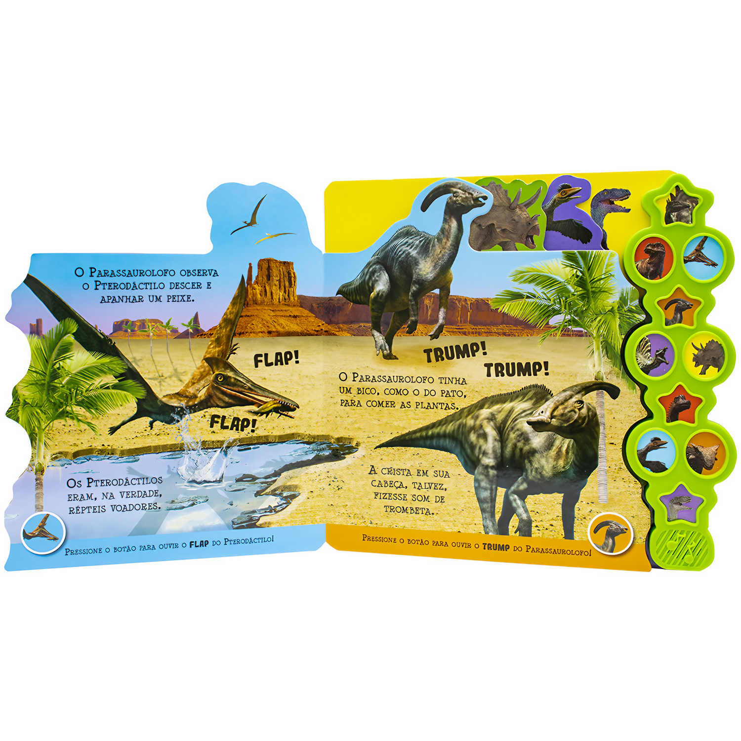 Módulos Sonoros: Com dez sons autênticos de dinossauros, os módulos sonoros adicionam uma dimensão sensorial emocionante à experiência de leitura. Ao pressionar as áreas designadas nas páginas, as crianças podem ouvir os rugidos, grunhidos e chamados dos dinossauros, tornando a aprendizagem sobre essas criaturas ainda mais envolvente e imersiva.