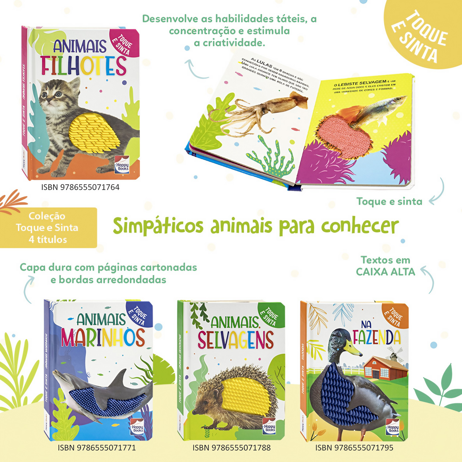 Formato e Acabamento: Com dimensões de 16x21 cm, este livro possui um formato cartonado resistente, ideal para mãos pequenas. O acabamento inclui laminação brilho para maior durabilidade e texturas de toque e sinta que proporcionam uma experiência tátil única.