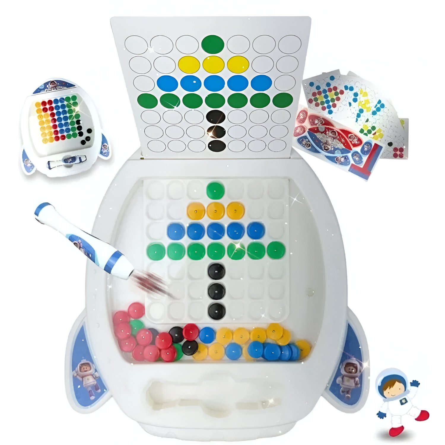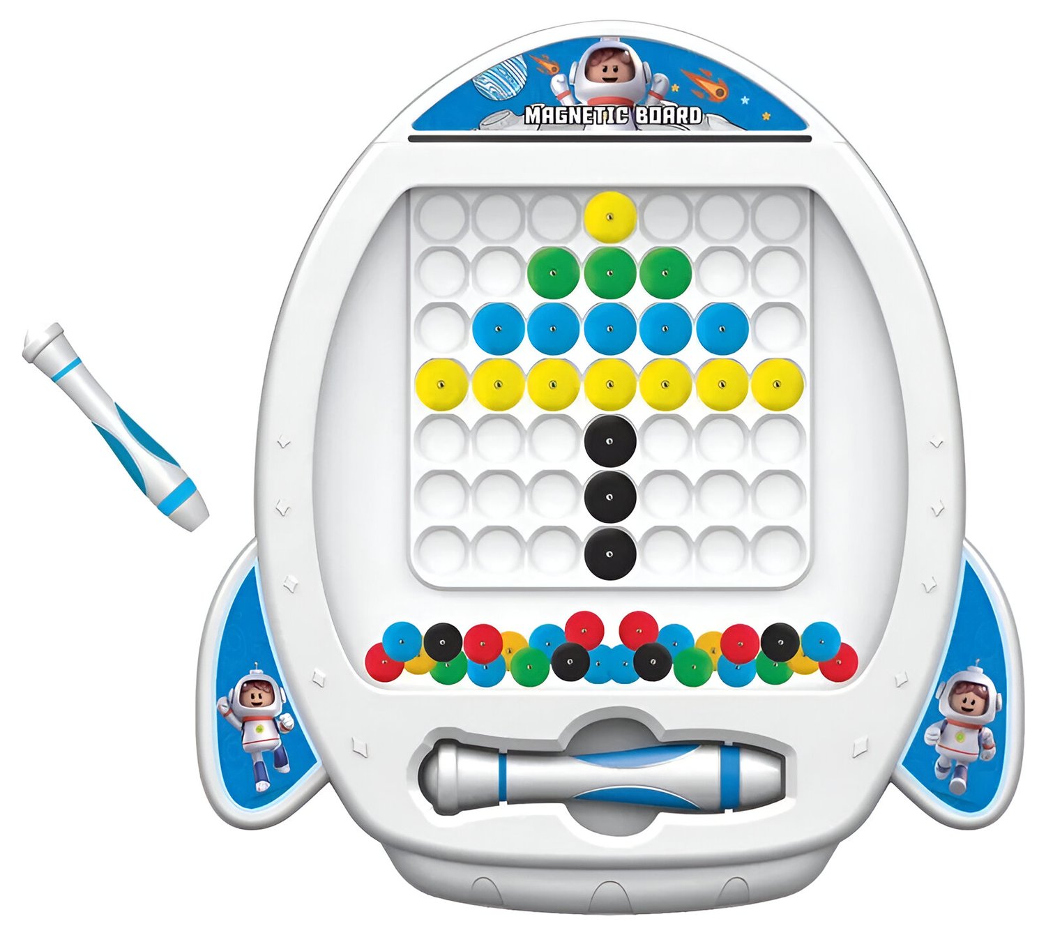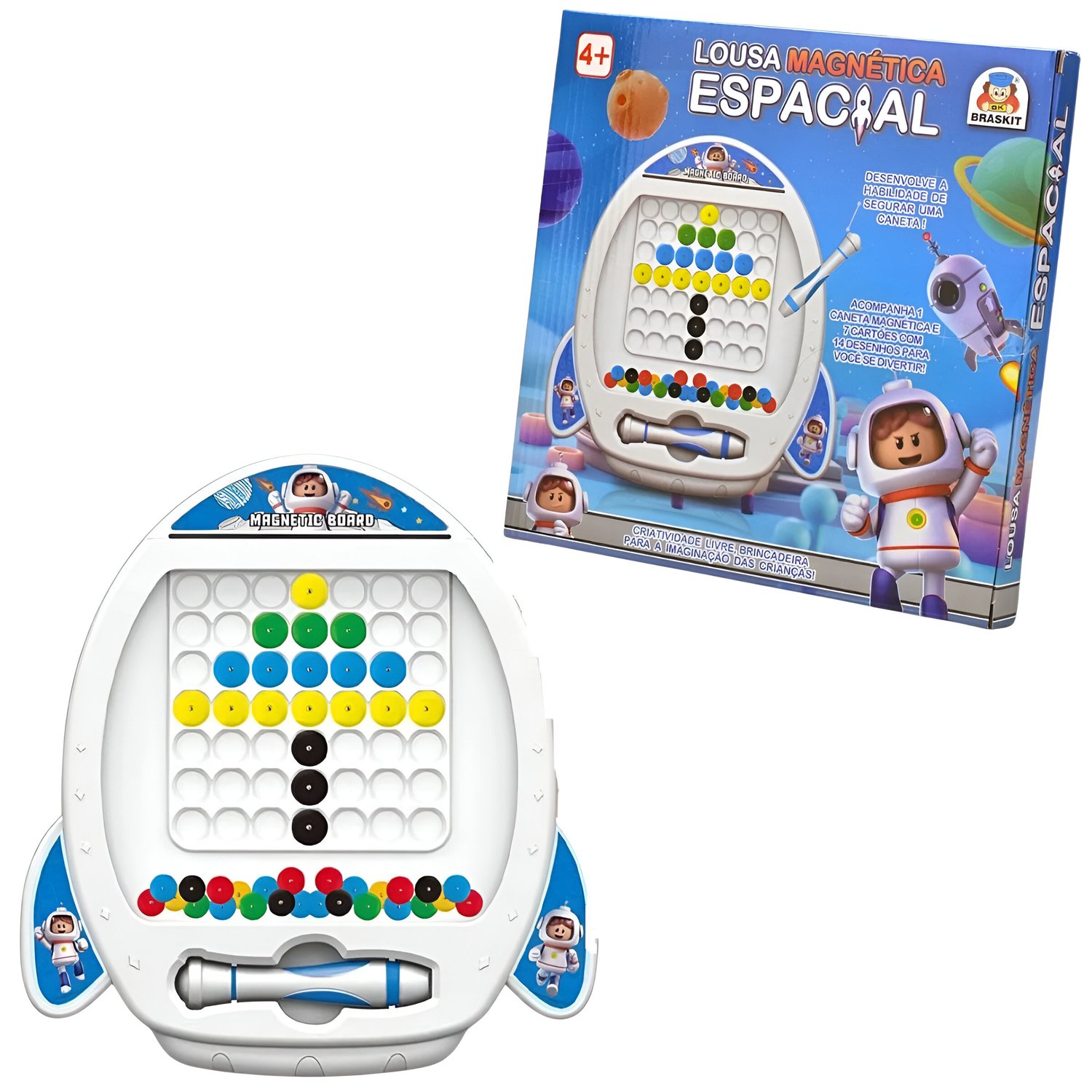 O Quadro Desenho Magnético Espacial é pura diversão e criatividade! Com ímãs coloridos e caneta magnética, as crianças podem desenhar e apagar quantas vezes quiserem. Acompanha 7 cartões com 14 modelos para inspirar novas criações e estimular a imaginação.