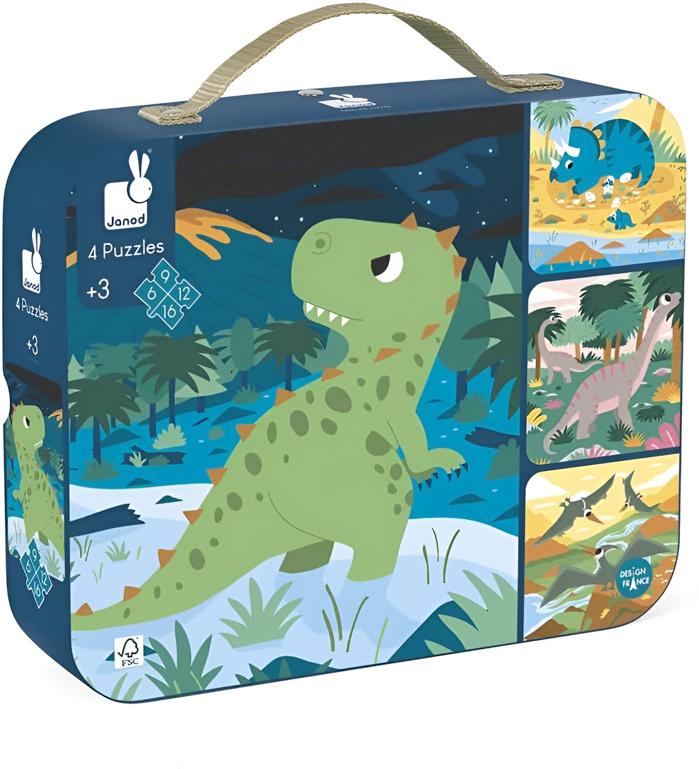 - • Conjunto com 4 quebra-cabeças temáticos de dinossauros.