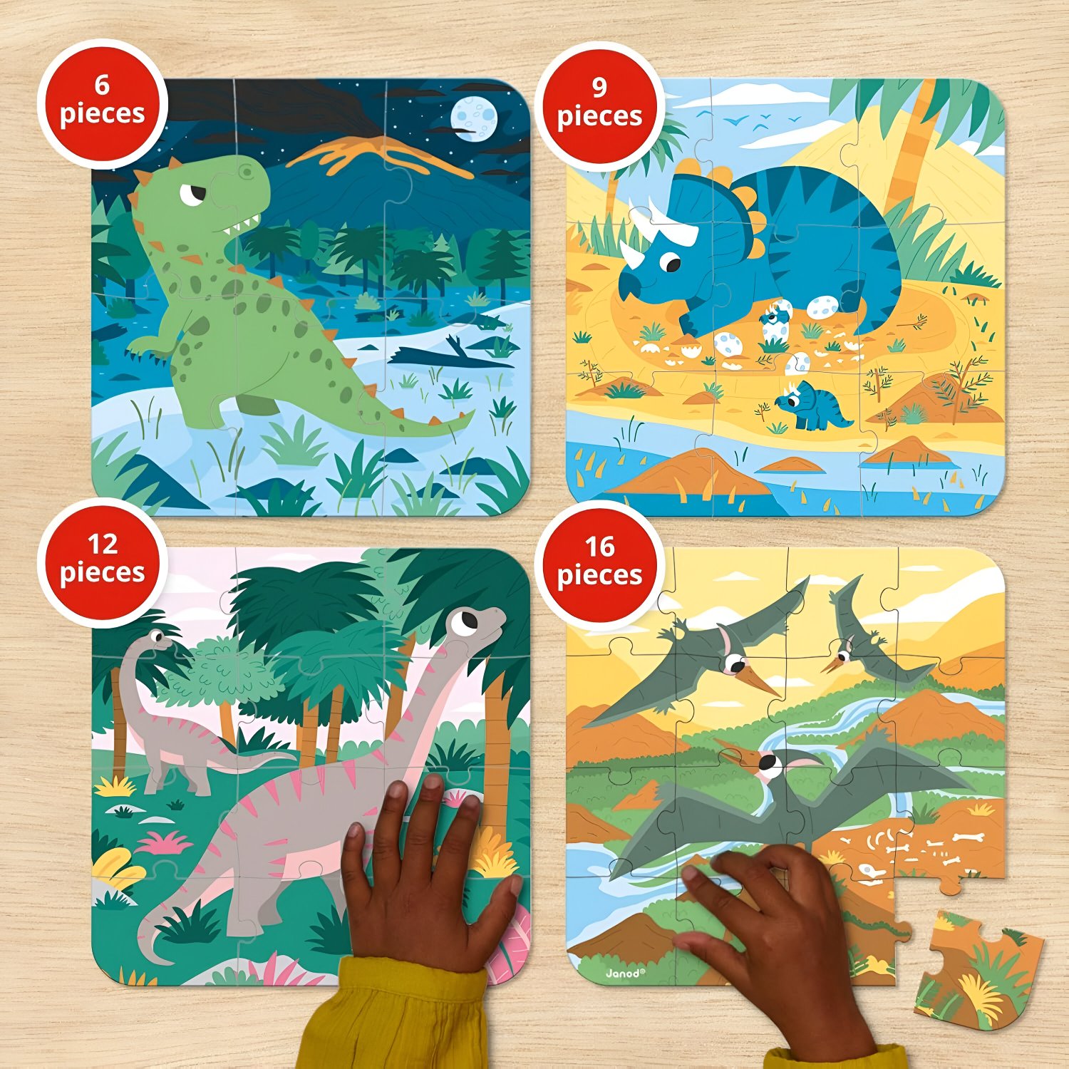 Desperte o pequeno paleontólogo com este incrível conjunto de 4 Quebra-Cabeças de Dinossauros! Cada quebra-cabeça vem com um número progressivo de peças (6, 9, 12 e 16), permitindo que a criança avance no seu próprio ritmo enquanto se diverte. Com cores diferentes no verso para facilitar a separação das peças, e ilustrações adoráveis de dinossauros, o aprendizado se torna ainda mais divertido.