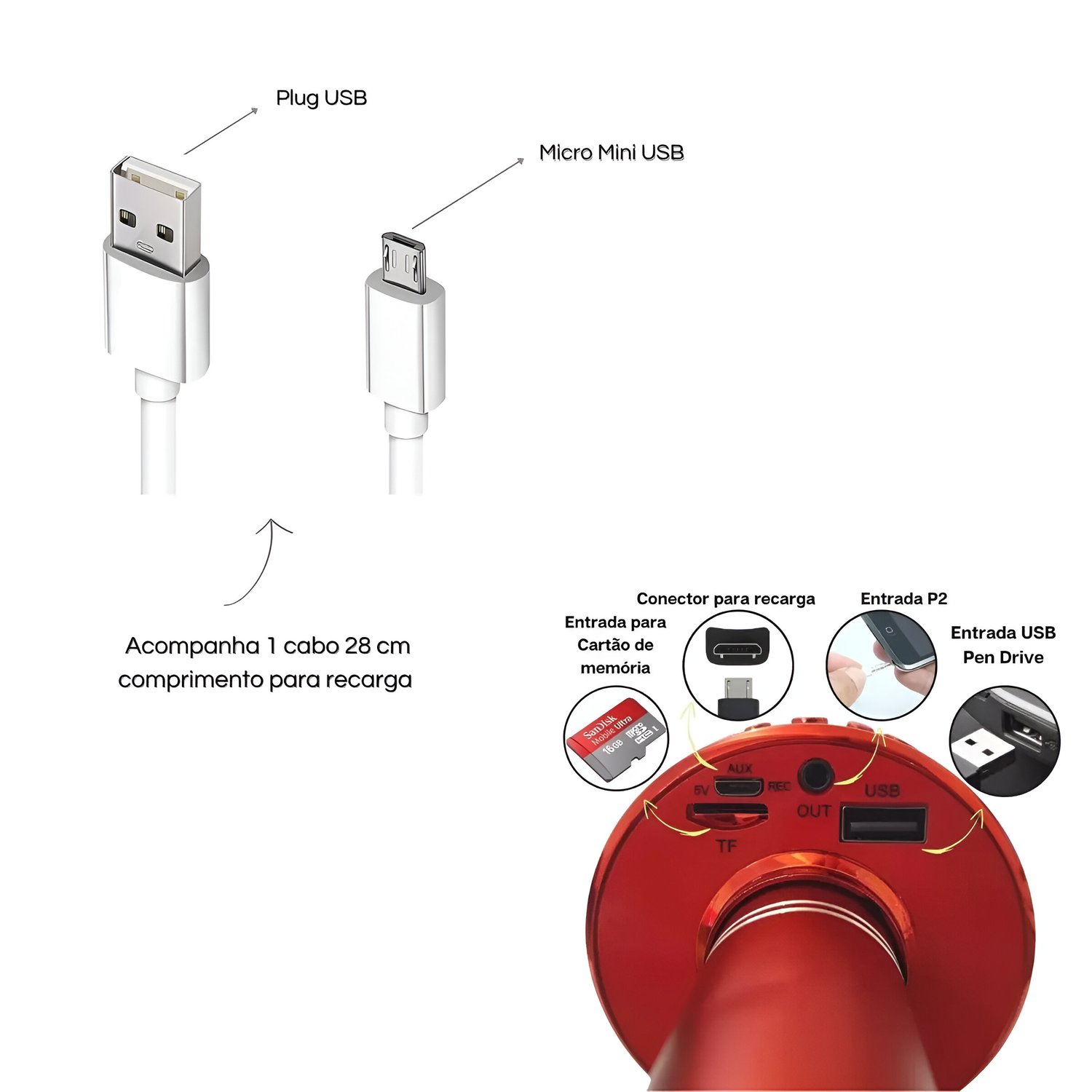 - Entrada USB e slot para cartão Micro SD.