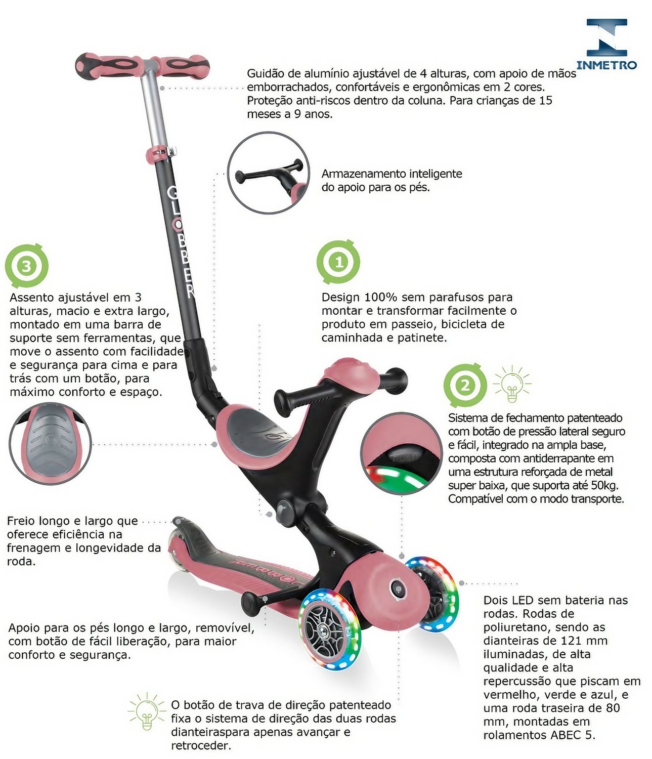 Apresentamos o Patinete 3 Rodas Globber Go Up Deluxe Lights, um equipamento versátil e inovador projetado para proporcionar uma experiência única às crianças. Fácil de montar e transformar, graças ao design 100% sem ferramentas, este patinete evolutivo oferece 3 modos: passeio, bicicleta de caminhada e patinete. Com um simples pressionar de botões, é possível alternar entre os modos, garantindo praticidade e diversão.