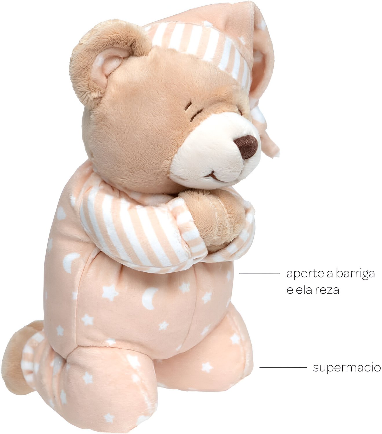 O Ursinho Que Reza da Buba é uma fofura que vai encantar os pequenos e seus pais! Ao apertar sua barriguinha, ele recita a linda oração do Anjo da Guarda, sendo o companheiro ideal para proporcionar noites tranquilas e cheias de paz. Feito com material supermacio, este ursinho oferece conforto e aconchego, além de ser um item perfeito para o desenvolvimento emocional dos bebês. Com seu design charmoso, ele também acrescenta um toque especial à decoração do quartinho.