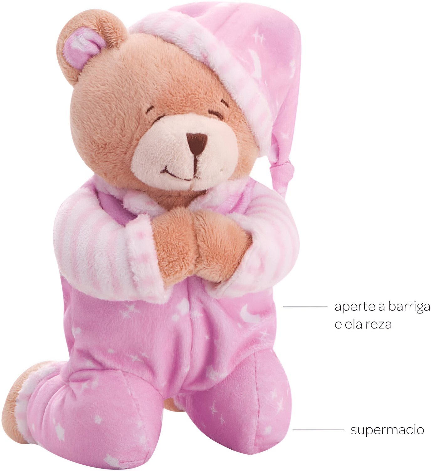 - Oração ao Anjo da Guarda: Ao apertar a barriguinha do ursinho, ele emite uma oração linda e reconfortante.