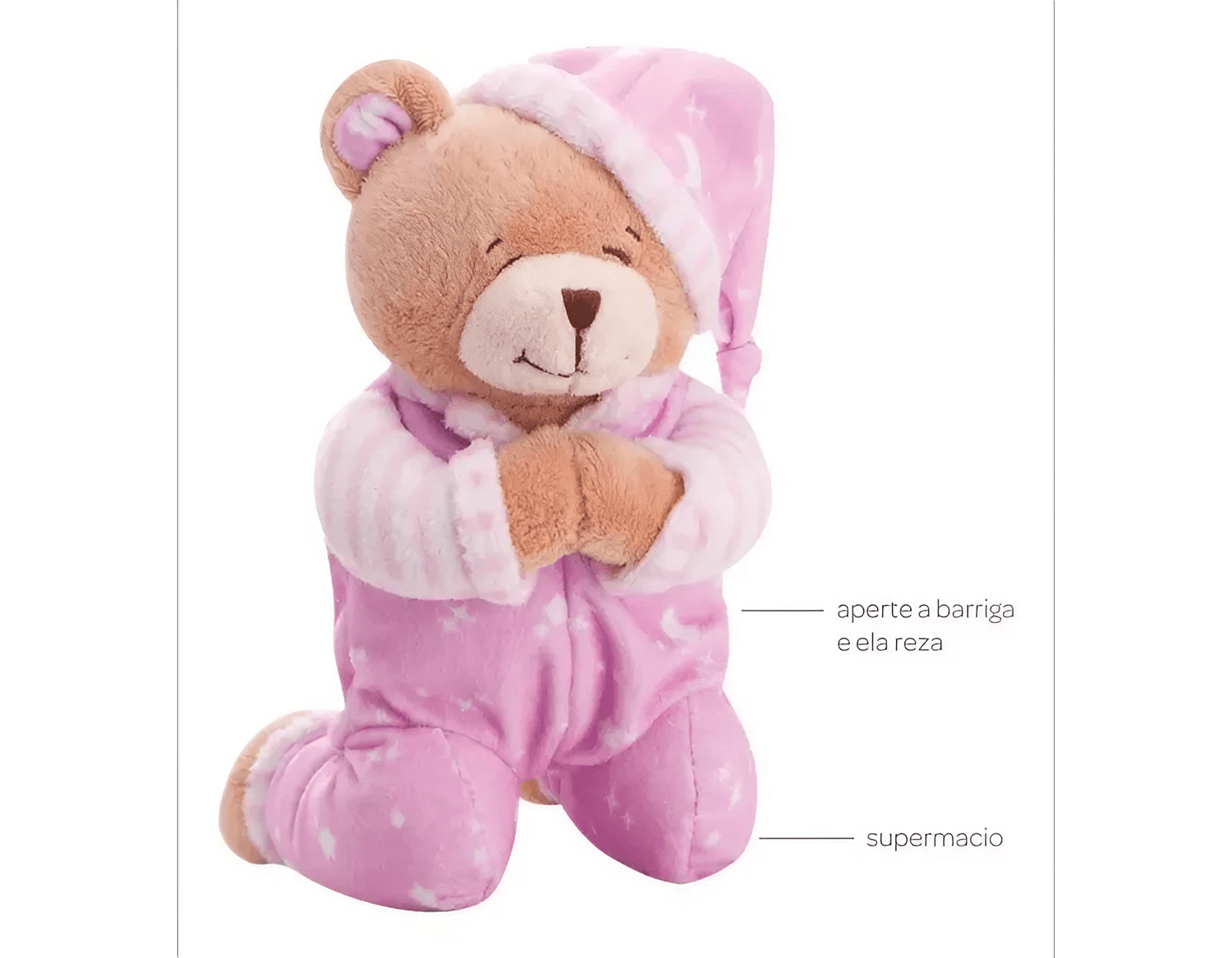 Reza do Anjinho da Guarda: Ao apertar sua barriguinha, o ursinho realiza uma oração do anjinho da guarda, proporcionando um momento sereno e reconfortante.