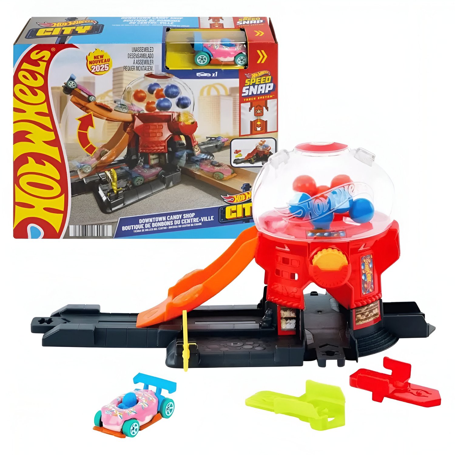 Prepare-se para uma aventura doce e cheia de ação com a Hot Wheels City Doceria do Centro da Cidade! Inspirada em uma gigante máquina de chicletes, essa pista supercolorida transforma a brincadeira em uma deliciosa corrida cheia de surpresas e imaginação. As crianças aceleram pela rampa de queda gravitacional, deslizando entre balas de goma que se movem com um toque de mágica no compartimento de moedas. No final do percurso, o carrinho é lançado pela rampa de saída, atravessando um portão móvel que se abre para novos caminhos e histórias eletrizantes!