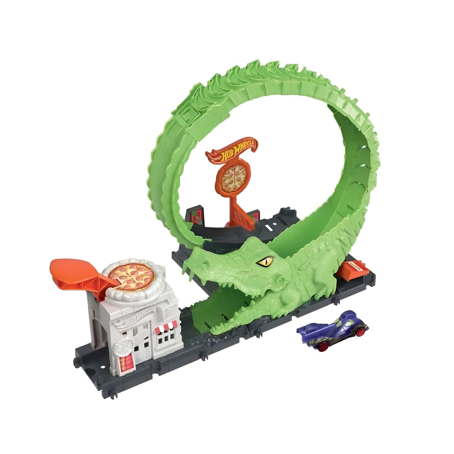 A aventura está servida… com um toque selvagem! No conjunto Hot Wheels Looping de Ataque do Crocodilo, um feroz crocodilo invadiu a pizzaria Hot Wheels e está faminto por carros! Só as crianças com as melhores manobras vão conseguir detê-lo. Reposicione a cauda gigante do crocodilo para criar um loop ou uma hélice, proporcionando diversas formas de brincar. O desafio é lançar o carro com precisão para derrubar o crocodilo e liberar o caminho rumo a novas aventuras!