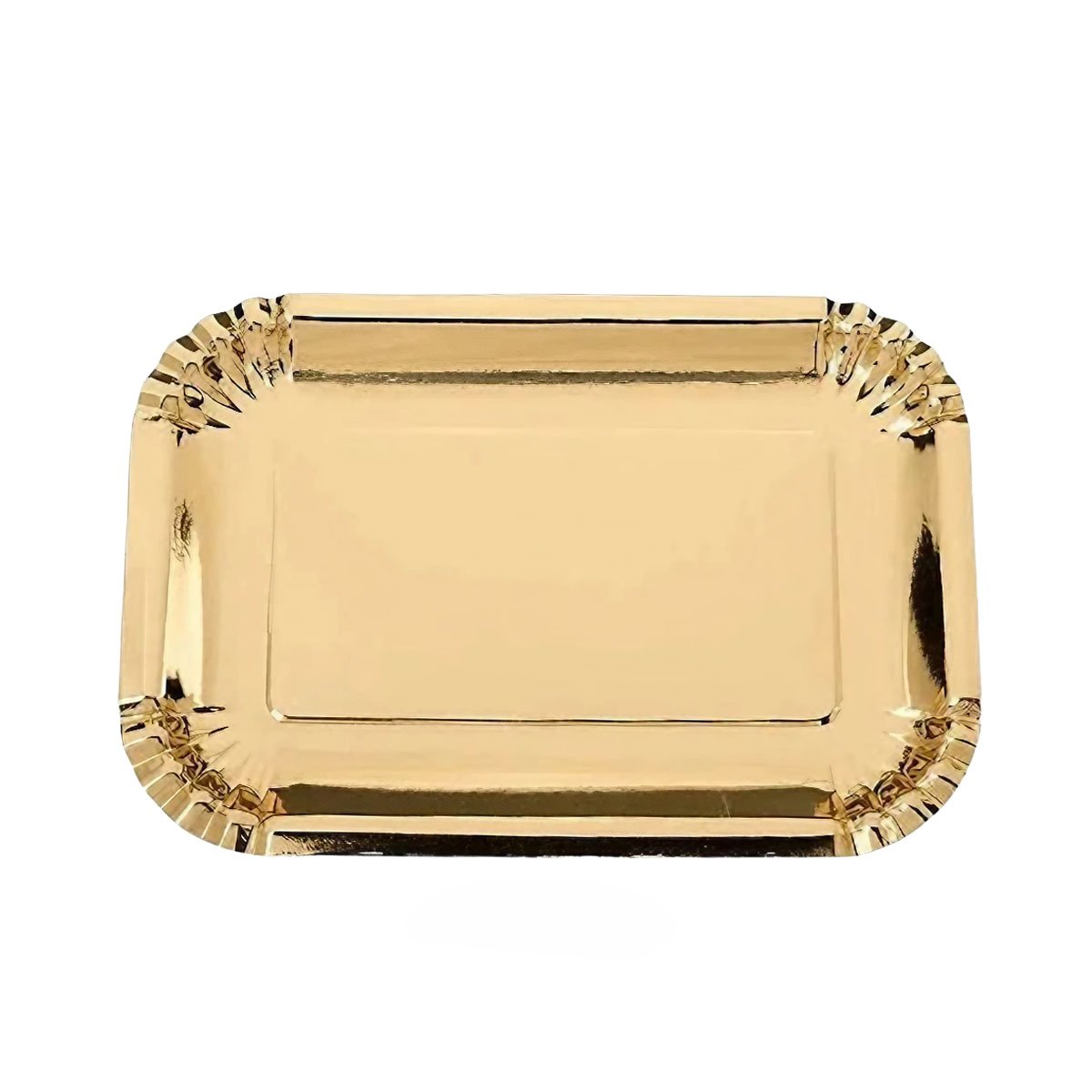 Desfrute de praticidade e elegância em suas refeições com o Prato de Papel Retangular Dourada. Ideal para diversas ocasiões!