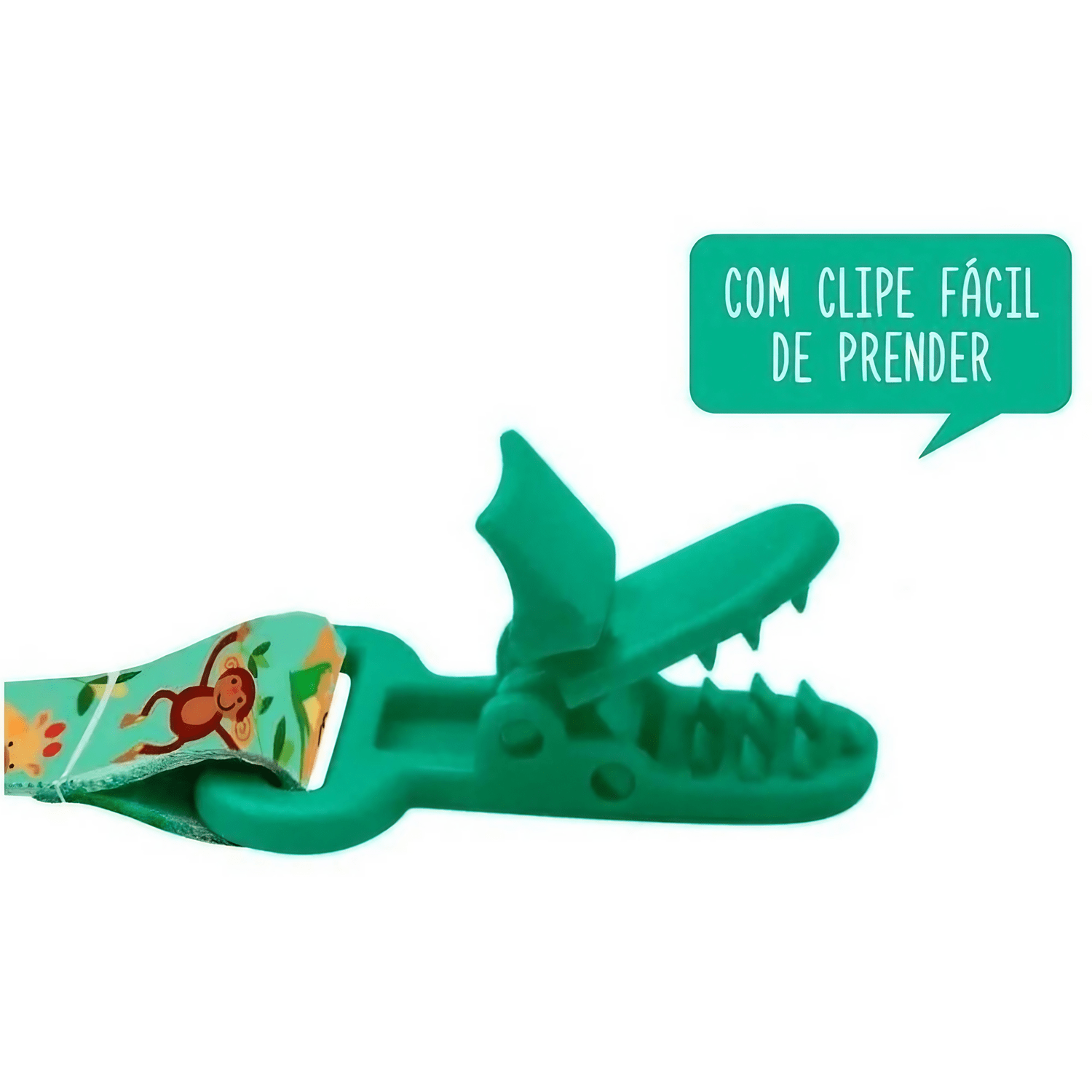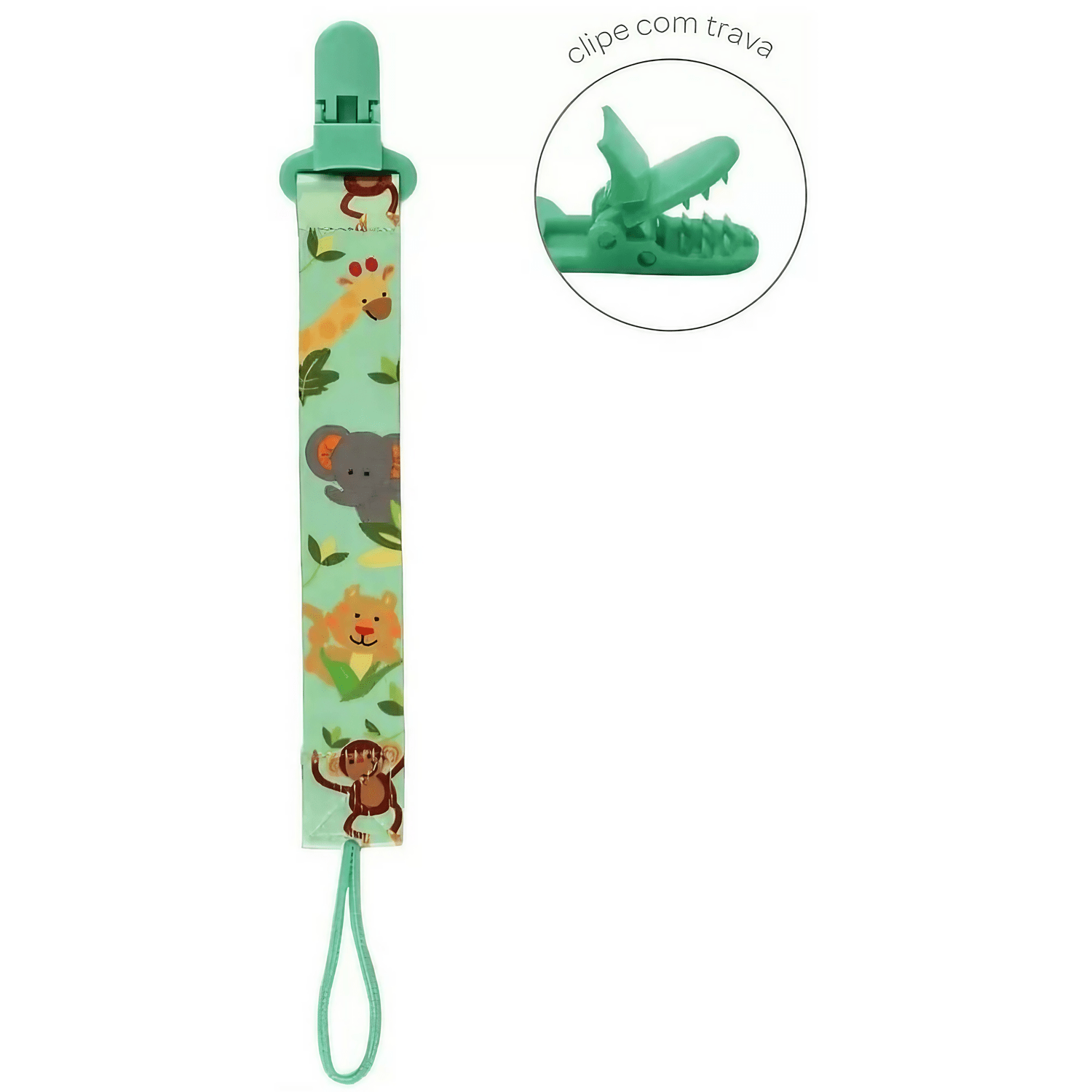 - Clipe com trava para garantir que a chupeta permaneça segura e limpa.