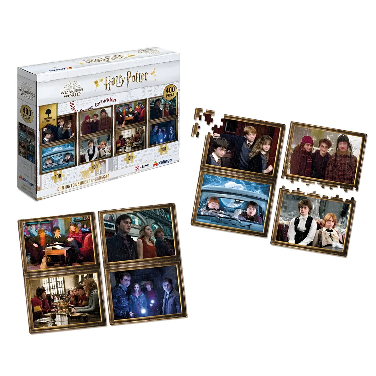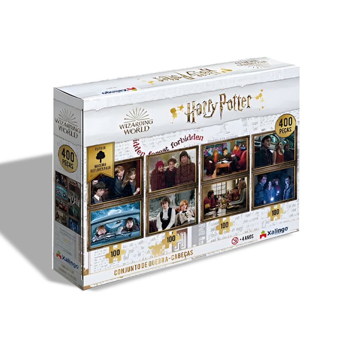 - Quatro Cenas Mágicas: Cada quebra-cabeça contém 100 peças, totalizando 400 peças, com diversos cenários do seu bruxo favorito.