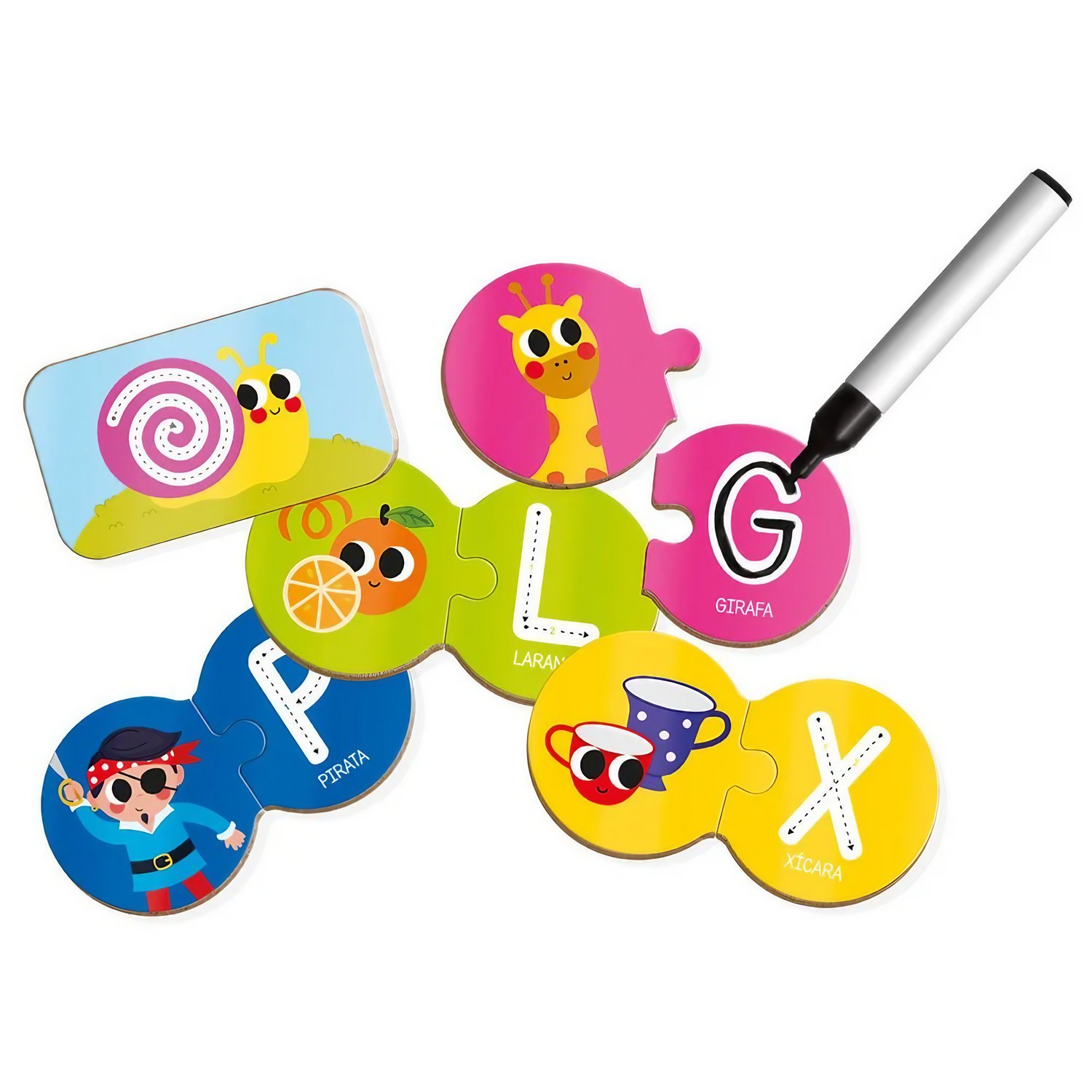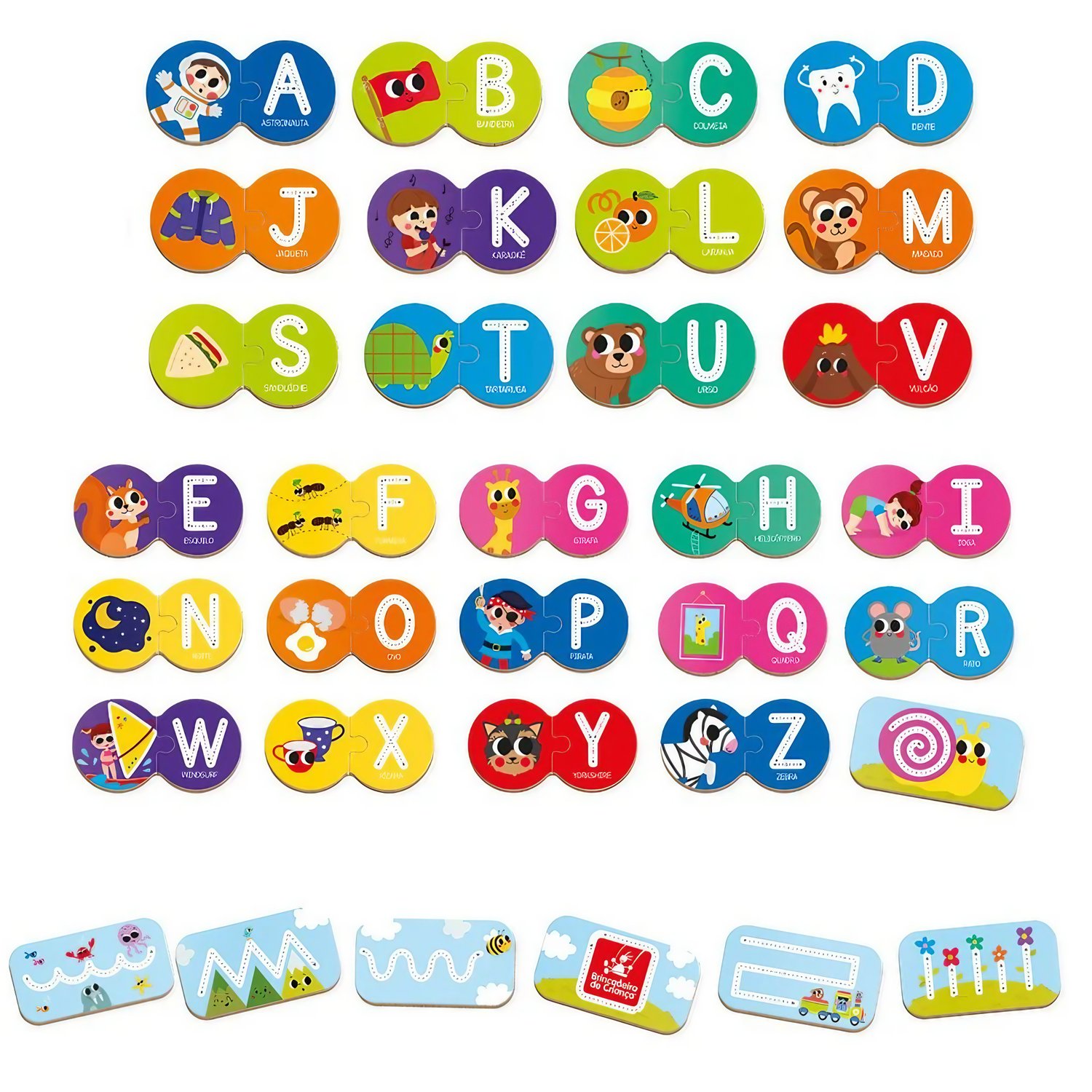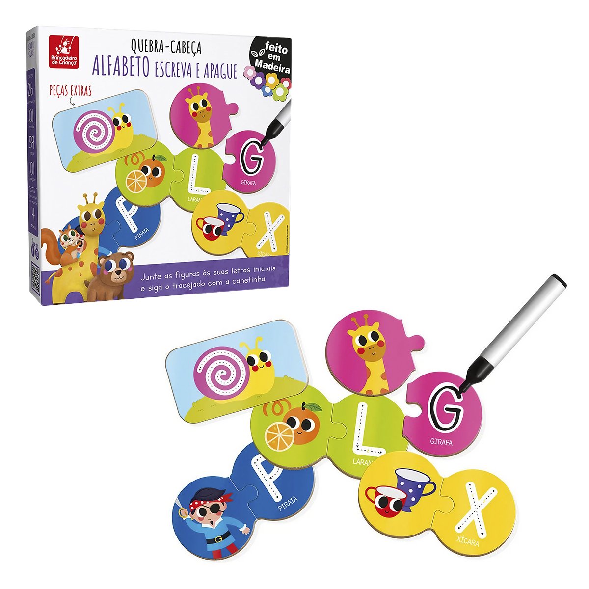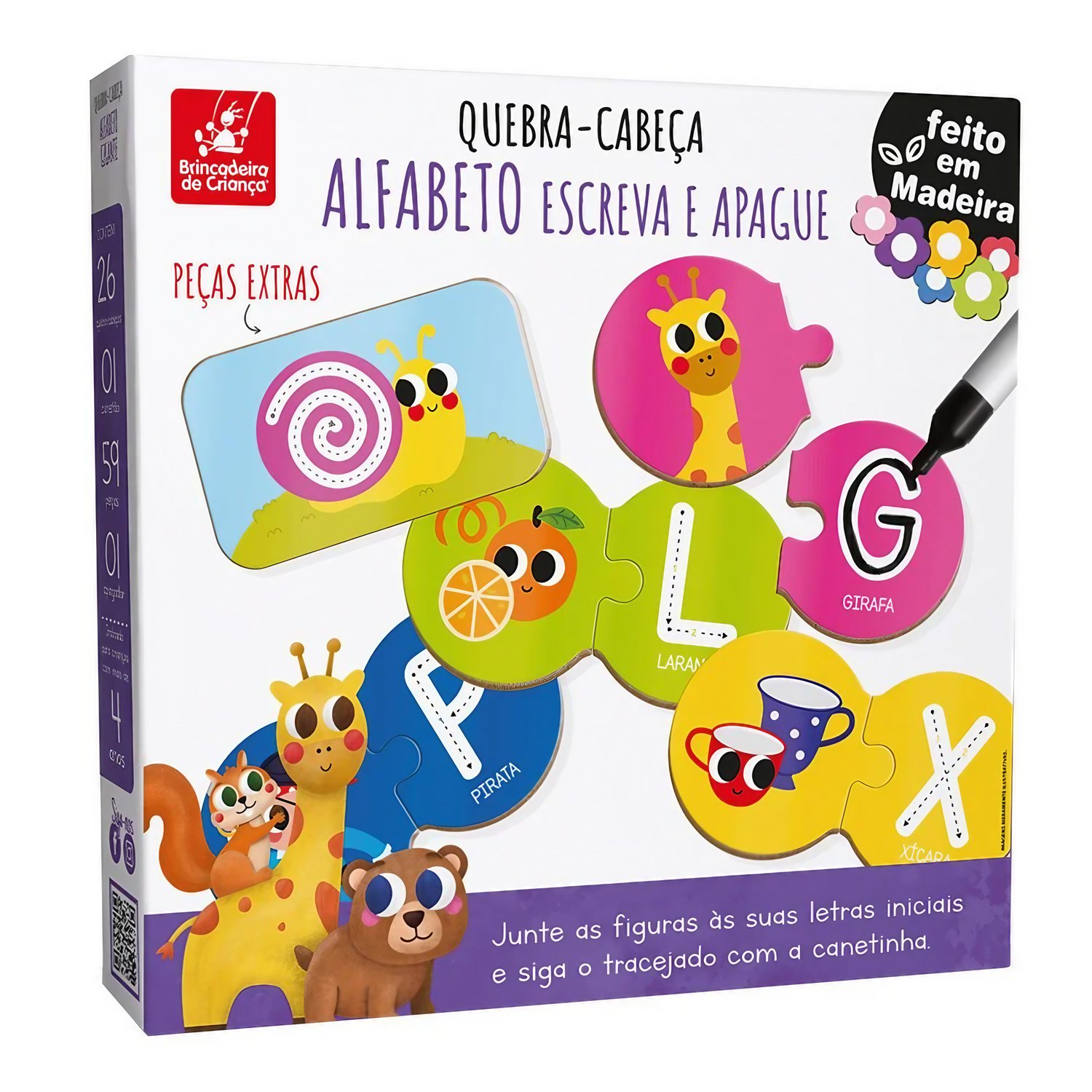 O Quebra-Cabeça Alfabeto Escreva e Apague é a maneira mais divertida de aprender a escrever! Composto por 26 quebra-cabeças, cada um representando uma letra do alfabeto, e mais 7 peças extras, oferece uma experiência interativa única. Utilize a caneta para desenhar as letras e conectá-las às figuras correspondentes, proporcionando uma abordagem prática e lúdica ao aprendizado.